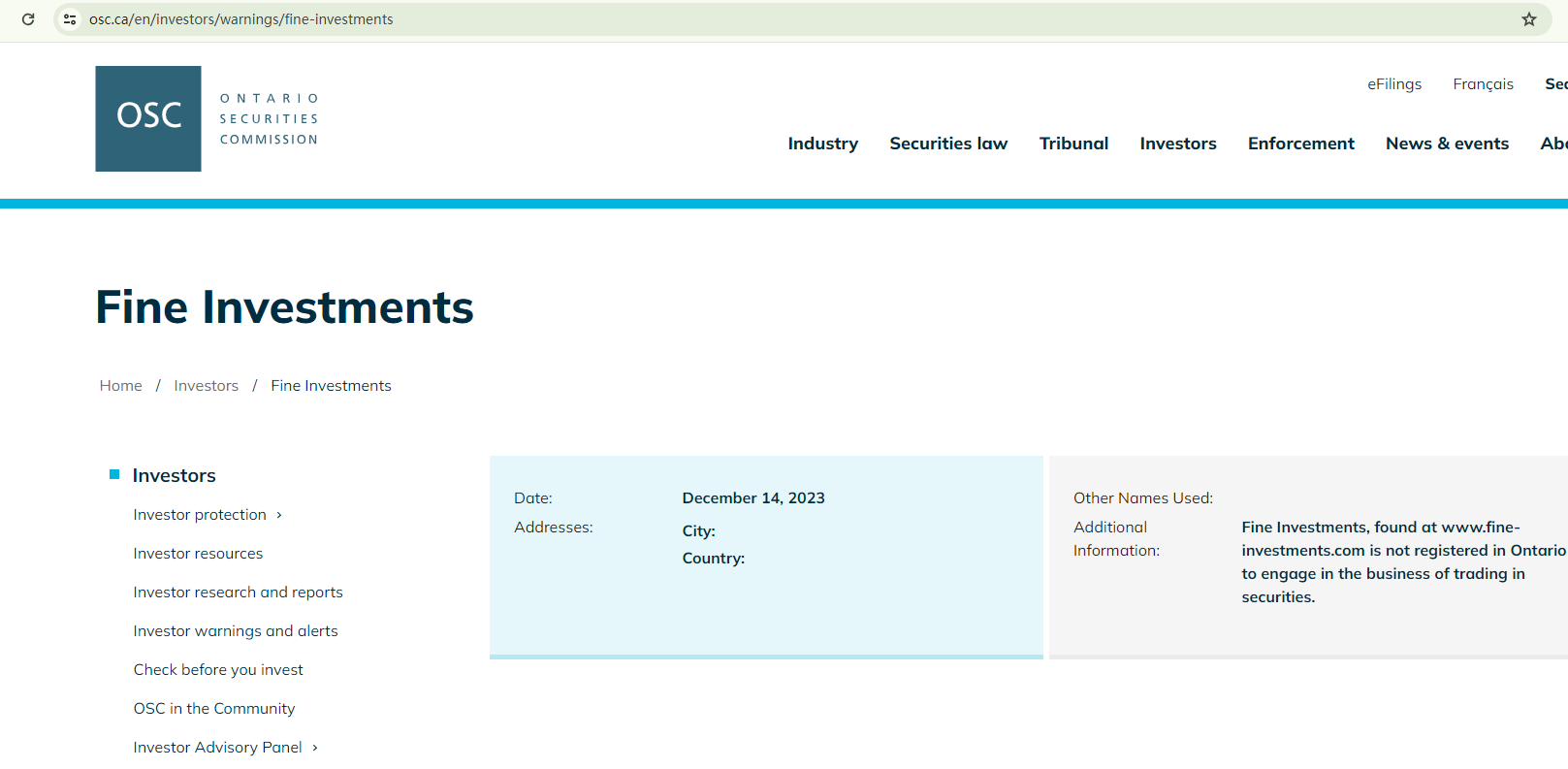 On December 14, 2023, the Ontario Securities Commission (OSC) issued a warning against Fine Investments, stating that this broker is not registered in Ontario to engage in the business of trading in securities. https://www.osc.ca/en/investors/warnings/fine-investments