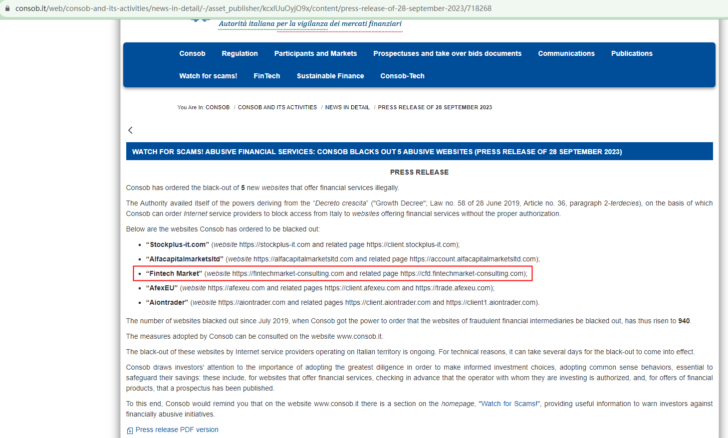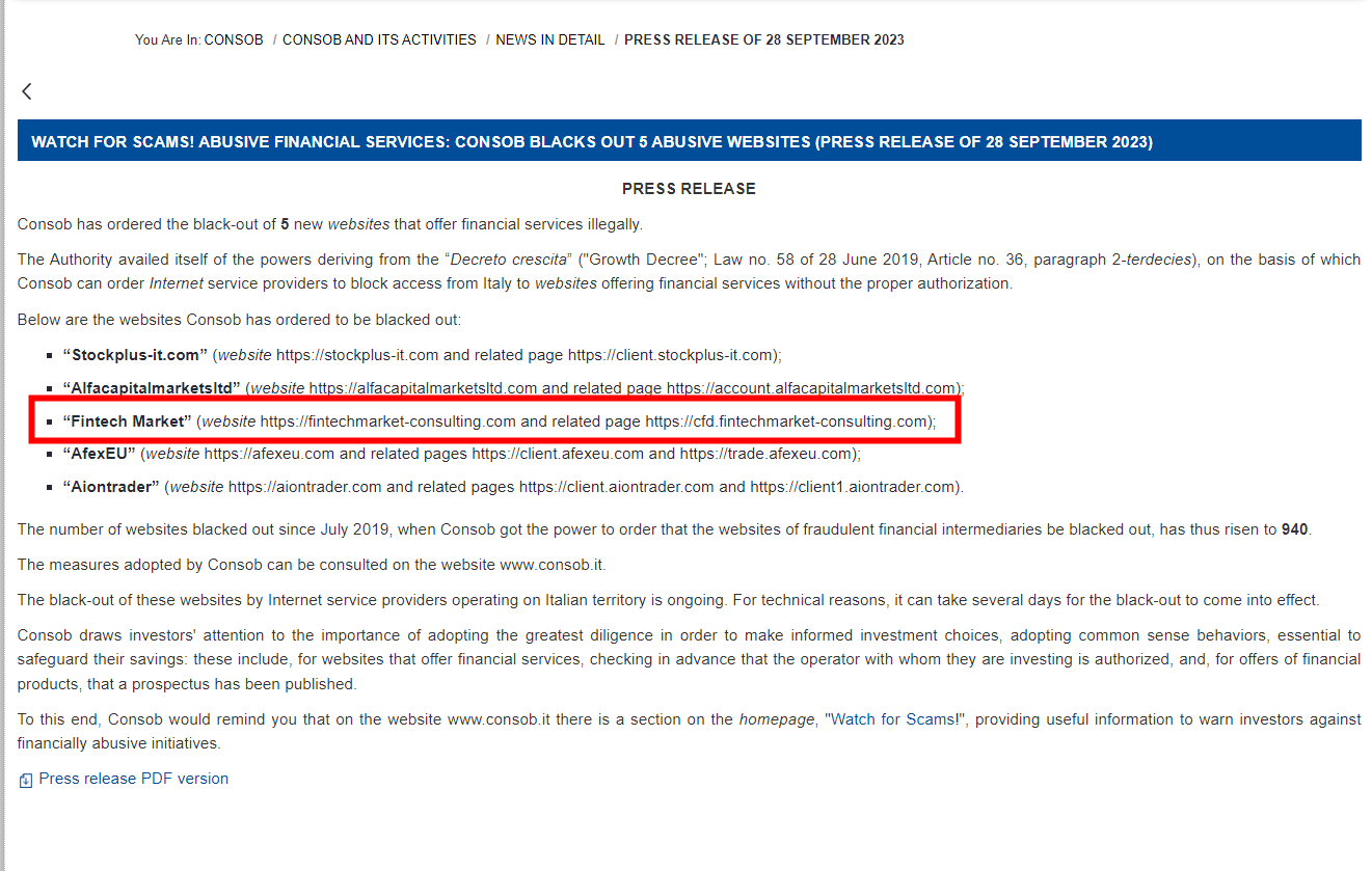 As Fintech Market continues its fraudulent activities, the Italian Companies and Exchange Commission (CONSOB), on September 28, 2023, ordered Fintech Market's website to be blacked out for the second time. https://www.consob.it/web/consob-and-its-activities/news-in-detail/-/asset_publisher/kcxlUuOyjO9x/content/press-release-of-28-september-2023/718268
