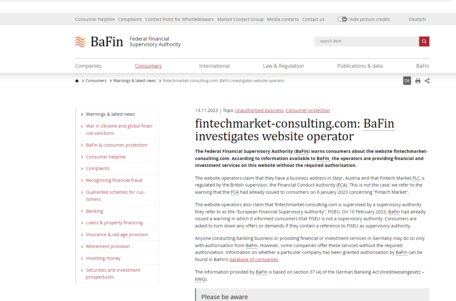 On 13 November 2023, the Federal Financial Supervisory Authority (BaFin) issued a warning that Fintech Market was providing financial services or products without authorization. You may visit: https://www.bafin.de/SharedDocs/Veroeffentlichungen/EN/Verbrauchermitteilung/unerlaubte/2023/meldung_2023_11_06_fintechmarket_consulting_en.html
