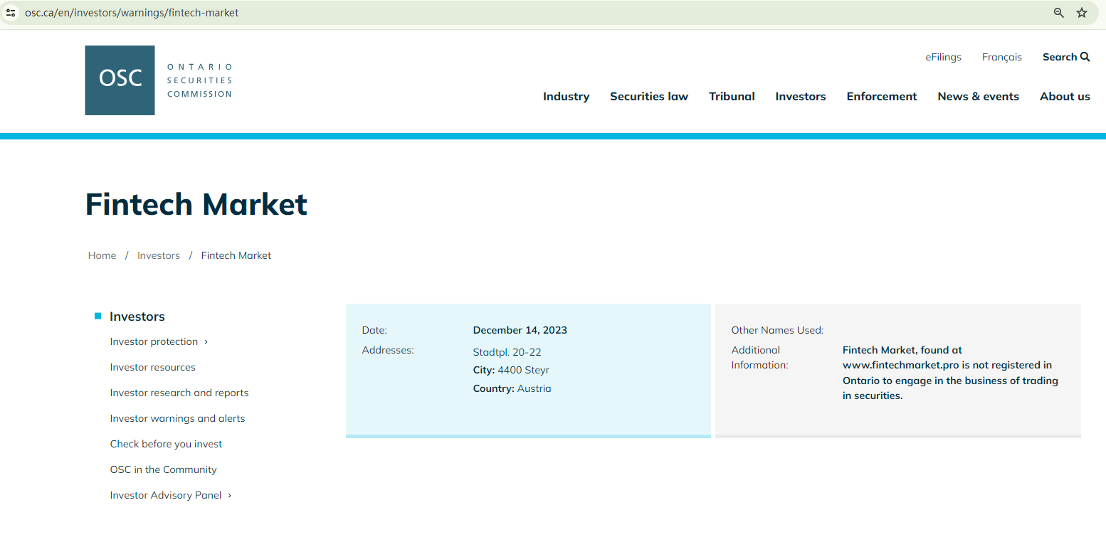 On December 14, 2023, the Ontario Securities Commission (OSC) issued a warning against Fintech Market, stating that this broker is not registered in Ontario to engage in the business of trading in securities. https://www.osc.ca/en/investors/warnings/fintech-market