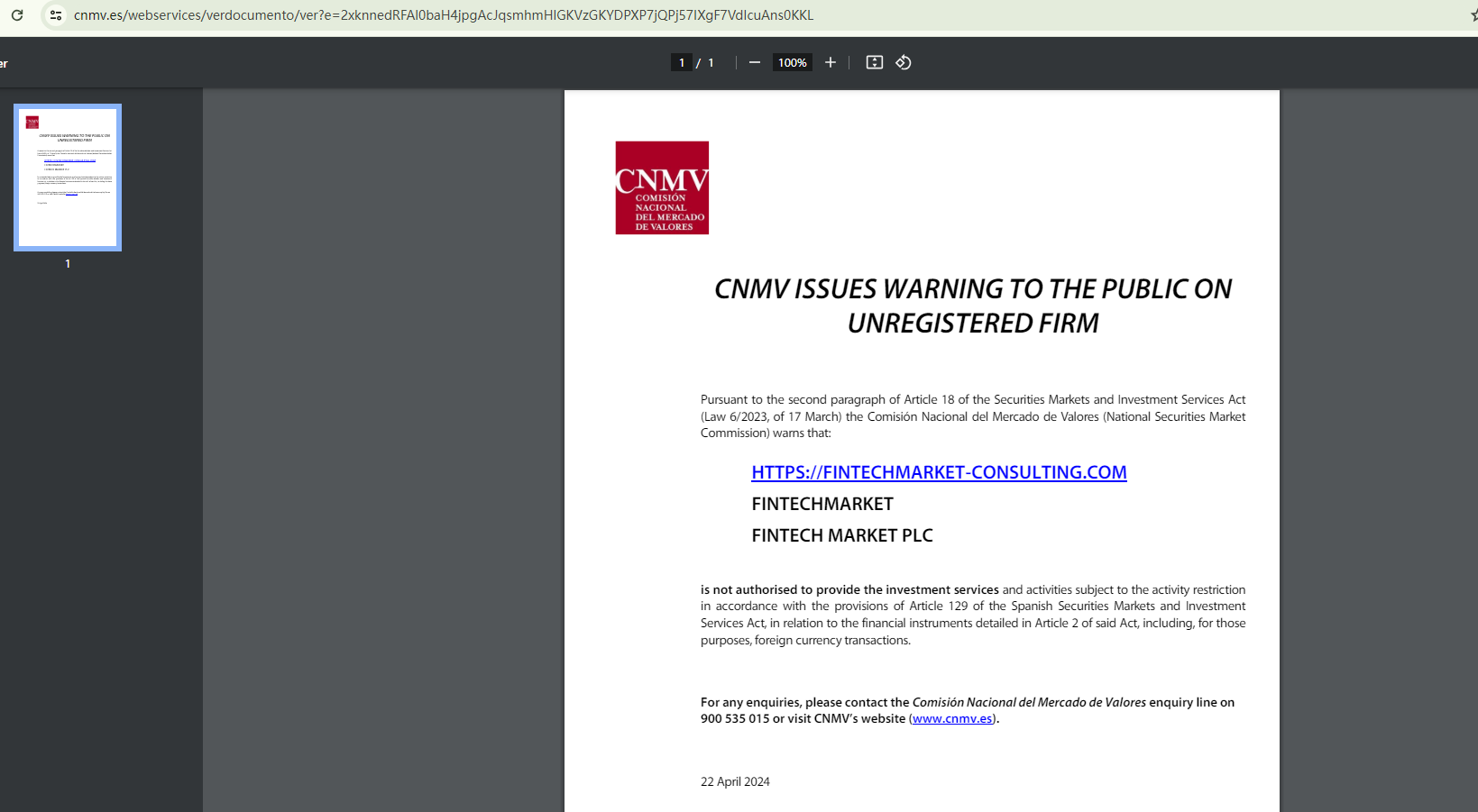 On April 22, 2024, the Comisión Nacional del Mercado de Valores (CNMV) added Fintech Market to its warning list for providing investment services without authorization. https://www.cnmv.es/portal/ResultadoBusqueda.aspx?tipo=1&nombre=FINTECHMARKET-CONSULTING