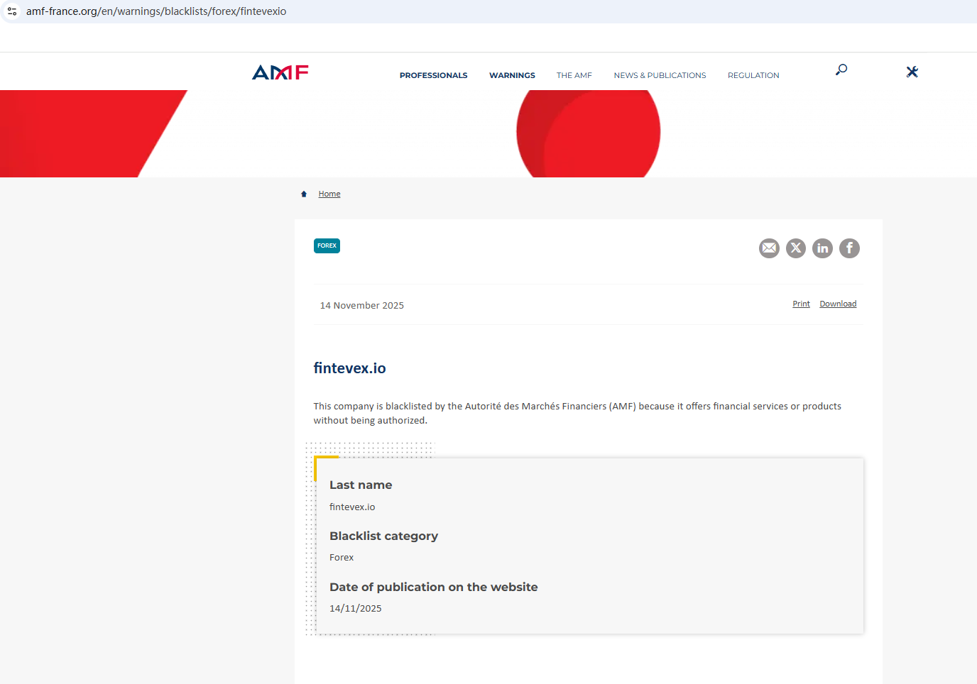 On Nov 14, 2025, the Financial Authority (Autorité des Marchés Financiers, AMF) added Fintevex to warning list for it being an unauthorized company engaging in forex activities. https://www.amf-france.org/en/warnings/blacklists/forex/fintevexio