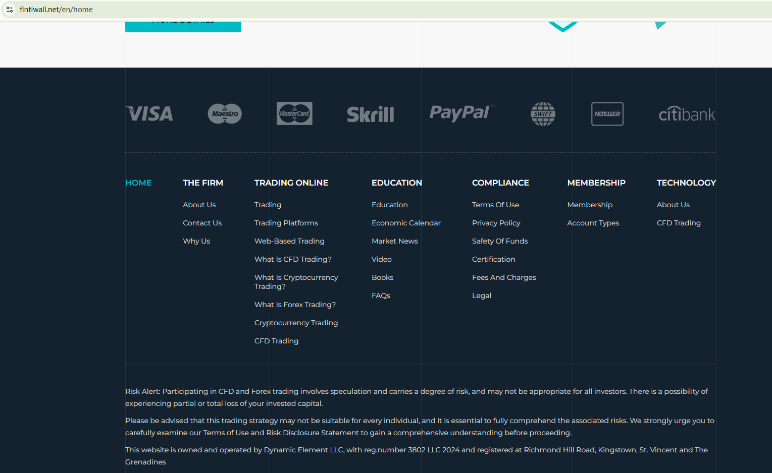 Fintiwall operates two websites, one of which is currently disabled—a potential warning sign. While Fintiwall claims to be affiliated with Dynamic Element LLC, which is registered with the Financial Services Authority of St. Vincent and The Grenadines (SVG FSA), this alleged affiliation appears to exist only on Fintiwall’s website. Our research has found no additional evidence to verify this claim. More concerningly, the Financial Conduct Authority (FCA) has issued a warning against Fintiwall for unauthorized solicitation of British investors.