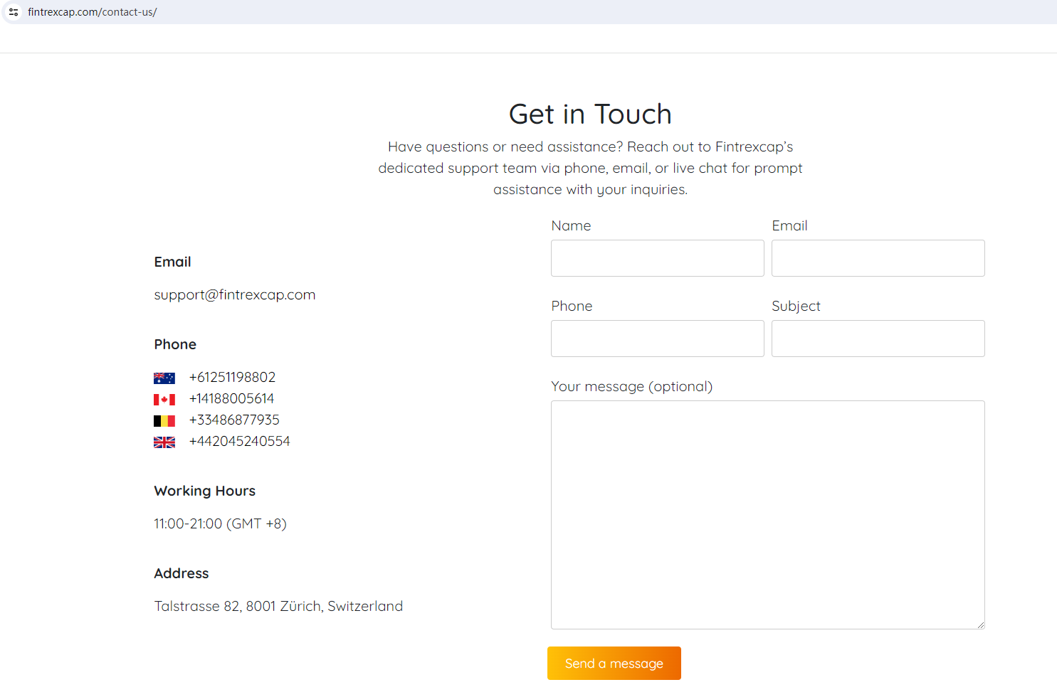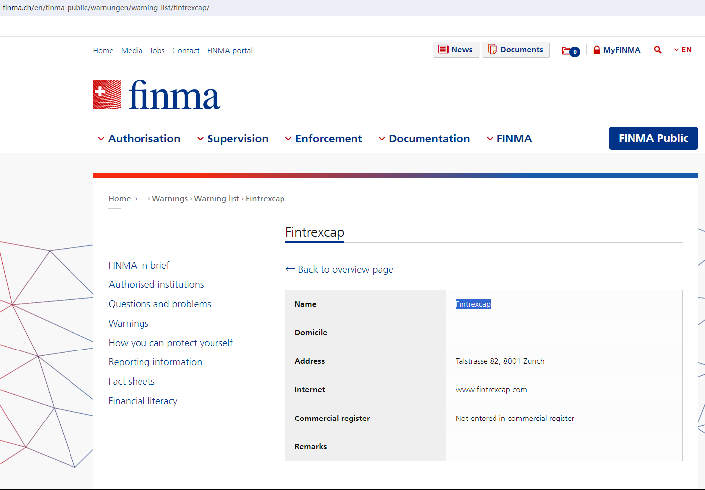 According to its website, it claims to be a reliable broker. However, no detailed regulatory information is displayed on the website for inquiry. In addition, it is located in the Switzerland. Upon investigation, we found that the Swiss Financial Market Supervisory Authority (FINMA) issued a warning against Fintrexcap stating that this broker is not supervised.