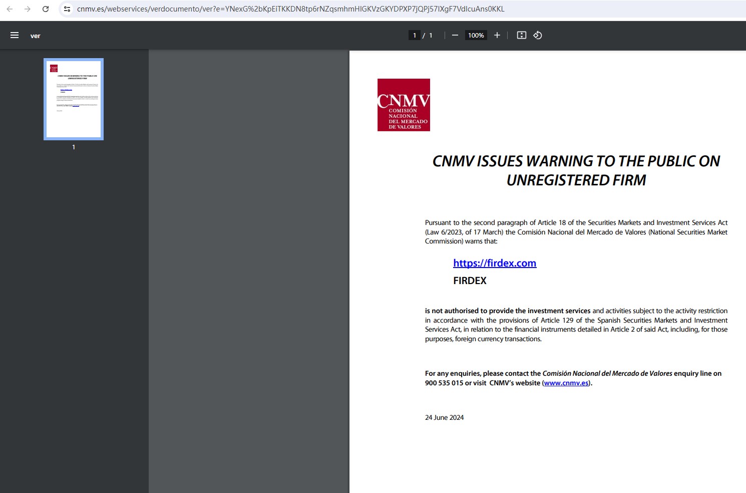 On June 24, 2024, the Comisión Nacional del Mercado de Valores (CNMV) added FIRDEX (HTTPS://FIRDEX.COM) to its warning list for providing investment services without authorization.You may visit: https://www.cnmv.es/webservices/verdocumento/ver?e=YNexG%2bKpEiTKKDN8tp6rNZqsmhmHlGKVzGKYDPXP7jQPj57IXgF7VdIcuAns0KKL.
