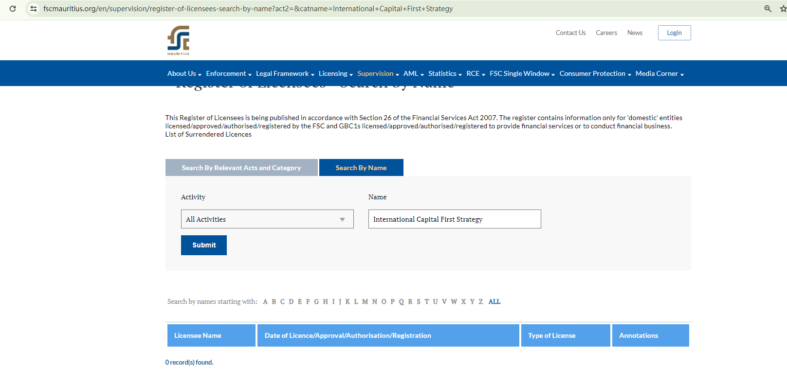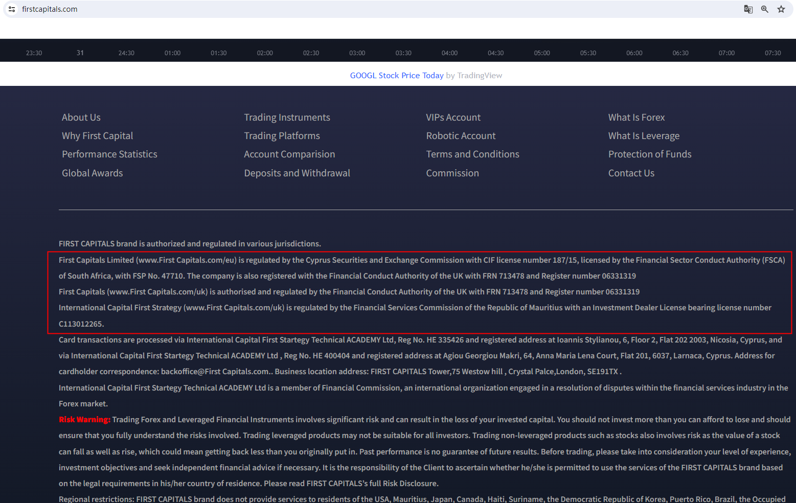 In addition, the company's homepage also mentions International Capital First Strategy, which is registered in Mauritius. After searching, no matching information was found in the Financial Services Commission, Mauritius (FSC Mauritius), and the website did not indicate that Firstcapital had any relationship with the brand.
