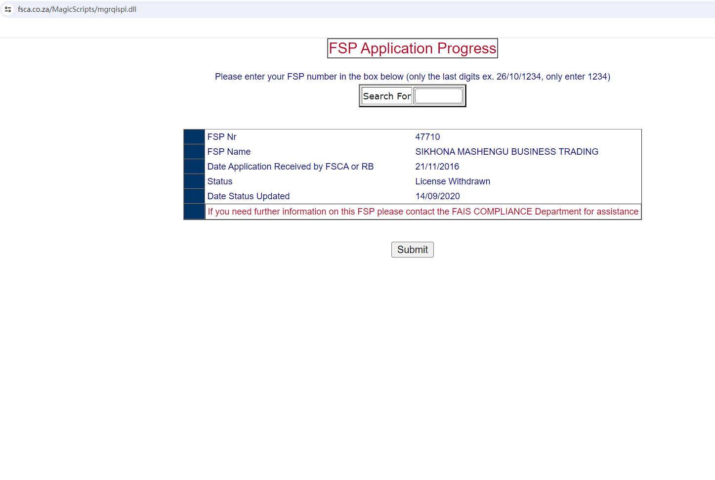 According to its website, it claims to be regulated by the Cyprus Securities and Exchange Commission (CySEC), but upon investigation, no matching information was found. It also claims to be regulated by the Financial Services Conduct Authority (FSCA). After inquiry, we found a company matching the 47710 number on the FSCA, but the company name is inconsistent with First Capital, and the registration status shows "License Withdrawn", which is obviously false regulatory information.