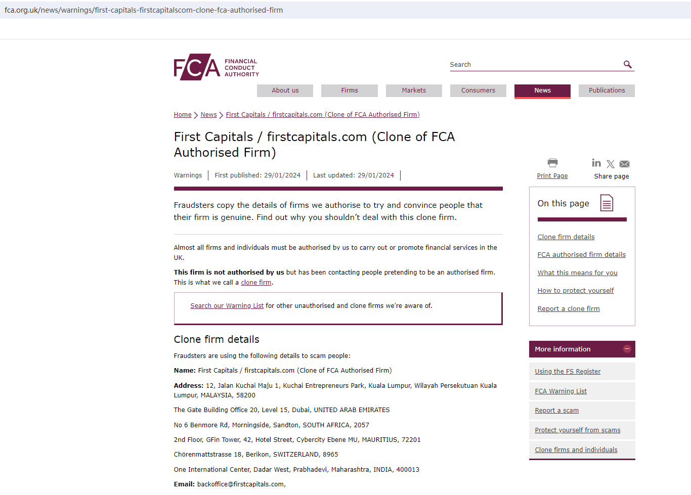 On January 29, 2024, the Financial Conduct Authority (FCA) issued a warning against First Capitals, identifying this company as a clone of an FCA-authorized firm. https://www.fca.org.uk/news/warnings/first-capitals-firstcapitalscom-clone-fca-authorised-firm