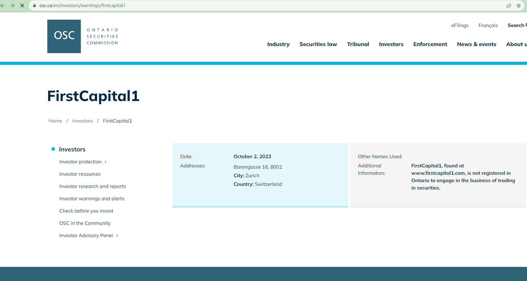 On October 2, 2023, the Ontario Securities Commission (OSC) issued a warning against FirstCapital1, stating that this broker is not registered in Ontario to engage in the business of trading in securities. https://www.osc.ca/en/investors/warnings/firstcapital1