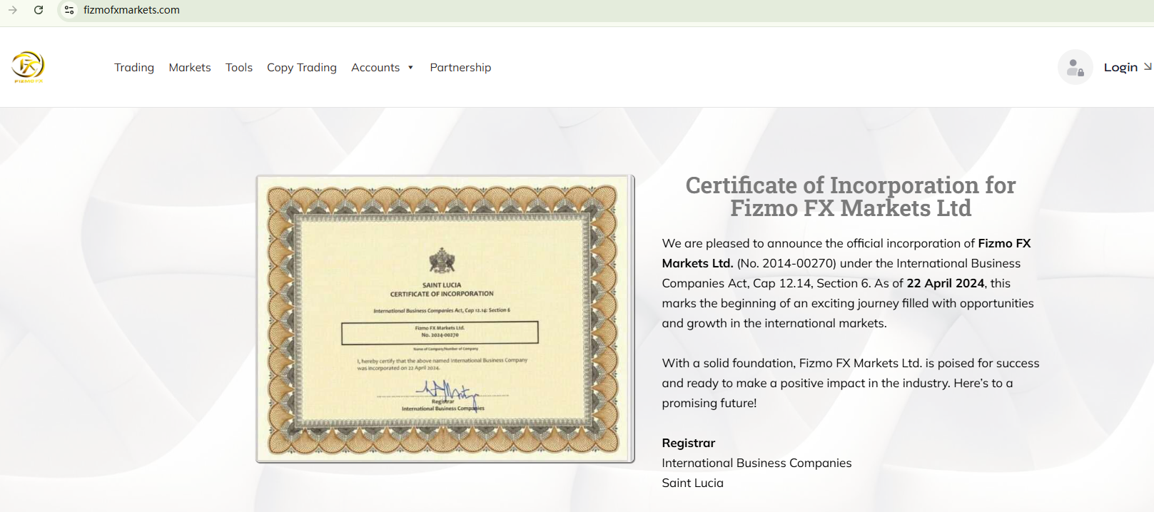 The website of FizmoFX Markets was registered in April 2024, making it a relatively new trading platform. The broker relies solely on an alleged registration in St. Lucia to demonstrate its legitimacy and regulatory compliance, which is insufficient. As an offshore center, St. Lucia provides lax supervision and minimal protections. Moreover, this jurisdiction does not license forex trading activities.