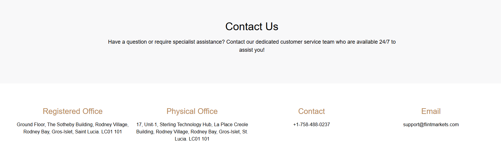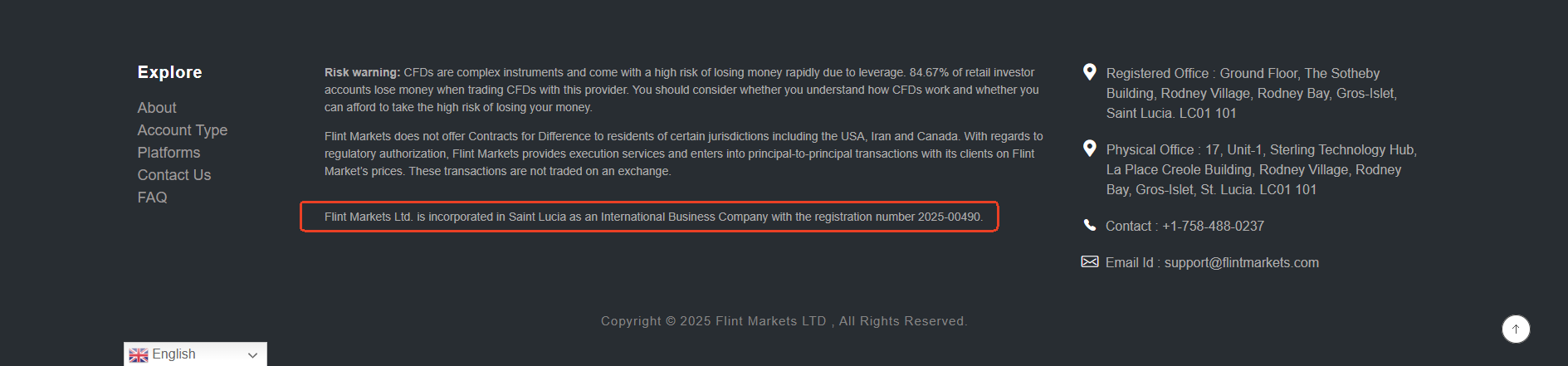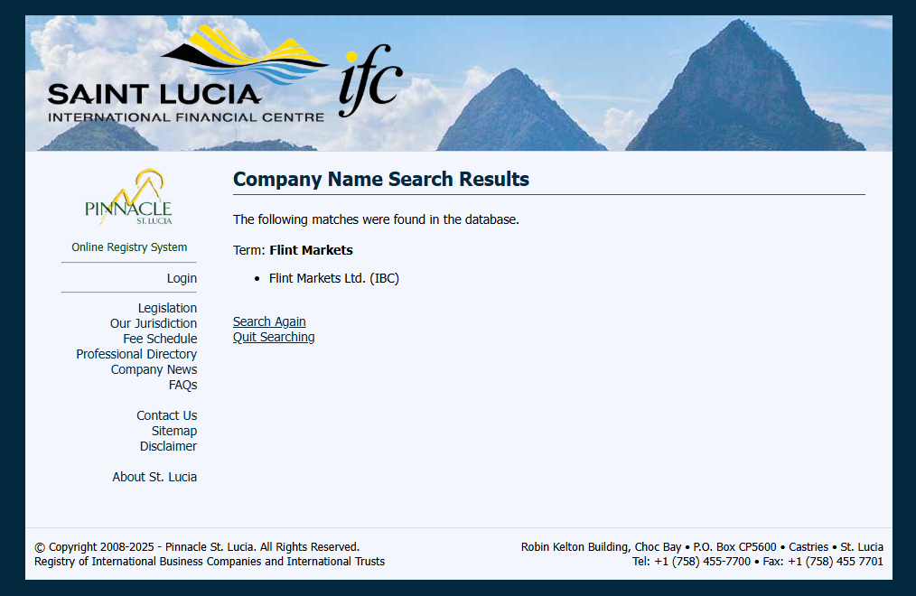Flint Markets claims to operate under Flint Markets Ltd, which is registered in Saint Lucia. While we confirm that a matching company exists in the registry of Saint Lucia International Financial Centre(IFC), this registration merely grants it International Business Company (IBC) status, which does not constitute a valid financial license. The IFC neither regulates nor licenses forex trading activities.