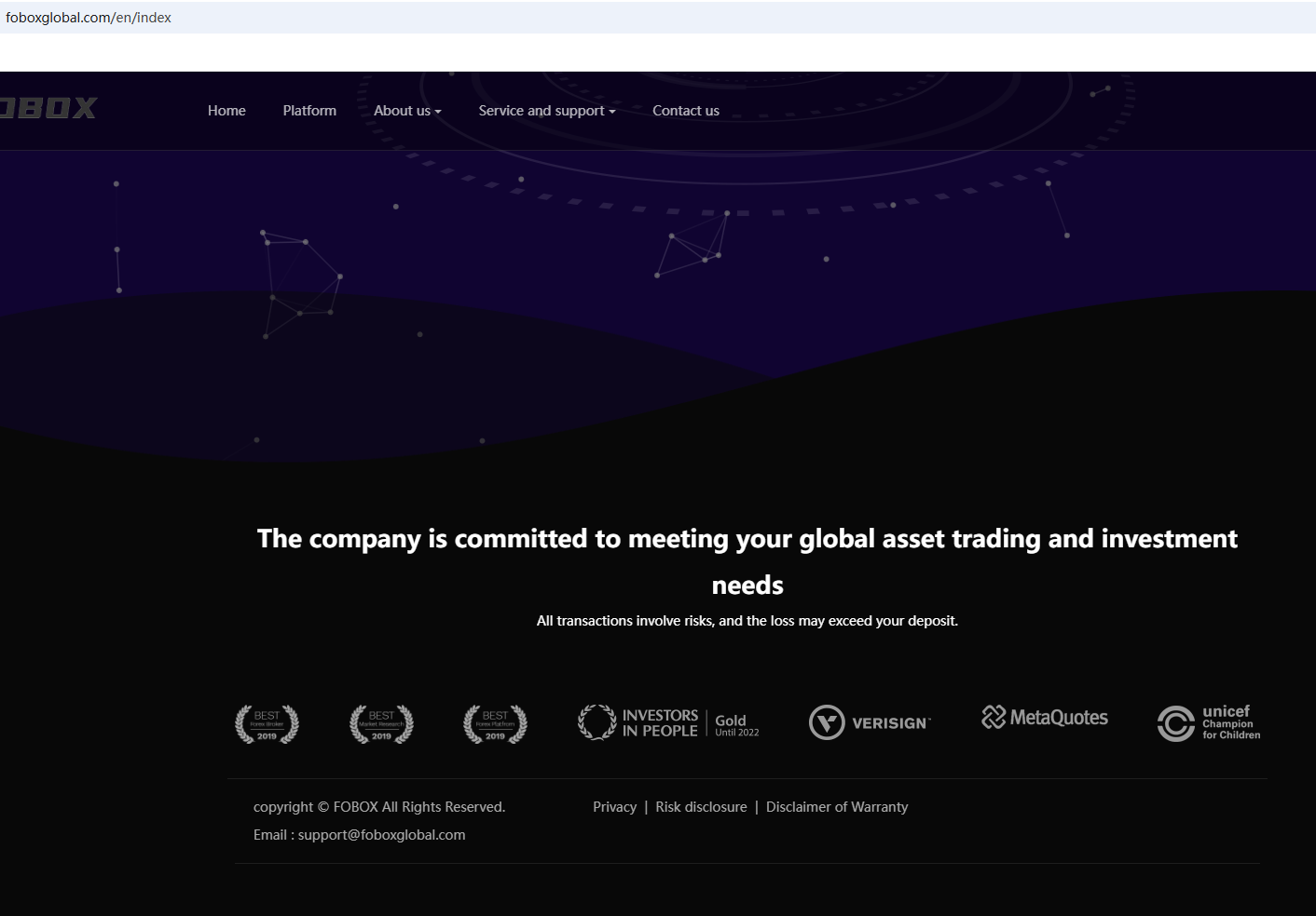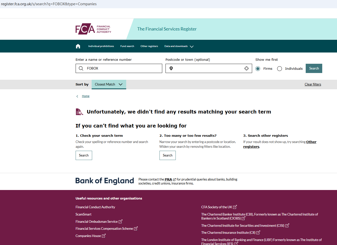 The website uses a common template for scam websites and has been flagged by Brokersview many times before. It claims to be located in the UK, but we did not find any matching information in the Financial Conduct Authority (FCA). The New Zealand Financial Markets Authority (NZ FMA) has blacklisted FOBOX for fraudulent activities. Therefore, FOBOX is a scam.