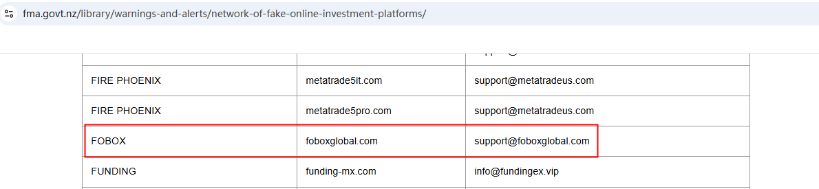 On February 17, 2025, the New Zealand Financial Markets Authority (NZ FMA) released a warning list, advising investors to stay vigilant about 96 suspicious investment including FOBOX. https://www.fma.govt.nz/library/warnings-and-alerts/network-of-fake-online-investment-platforms/