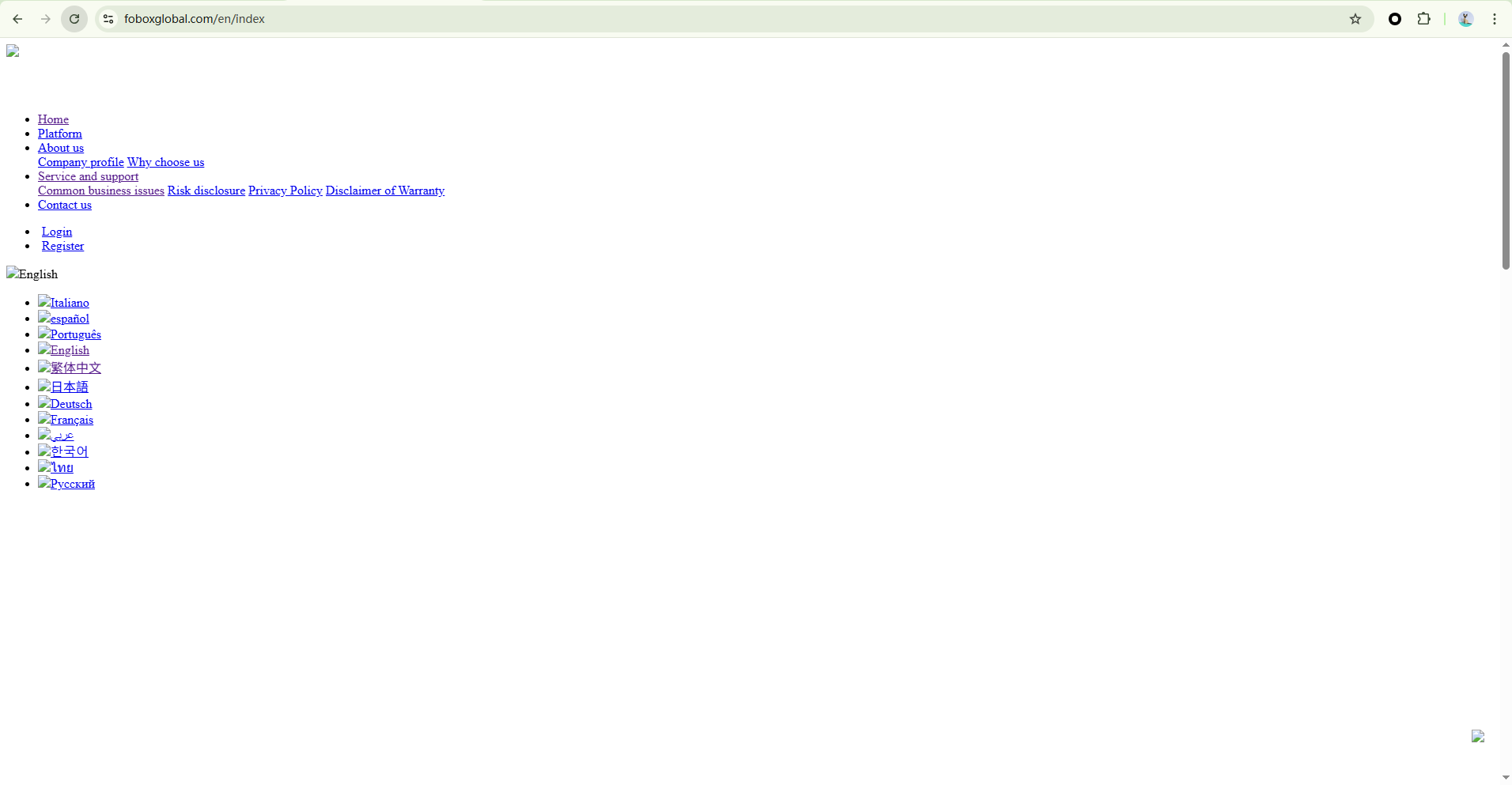 BrokersView has found that the domain "https://foboxglobal.com/en/index" is accessible but displays abnormal content. This is widely considered a significant red flag, as website access issues or display anomalies for trading platforms often indicate potential operational difficulties or underlying regulatory concerns.