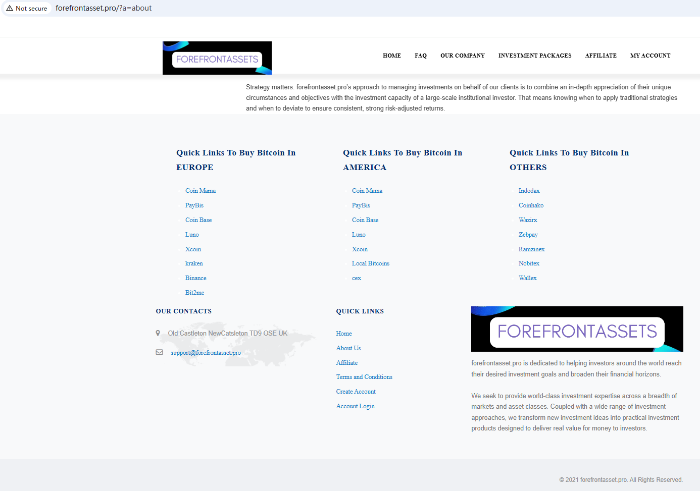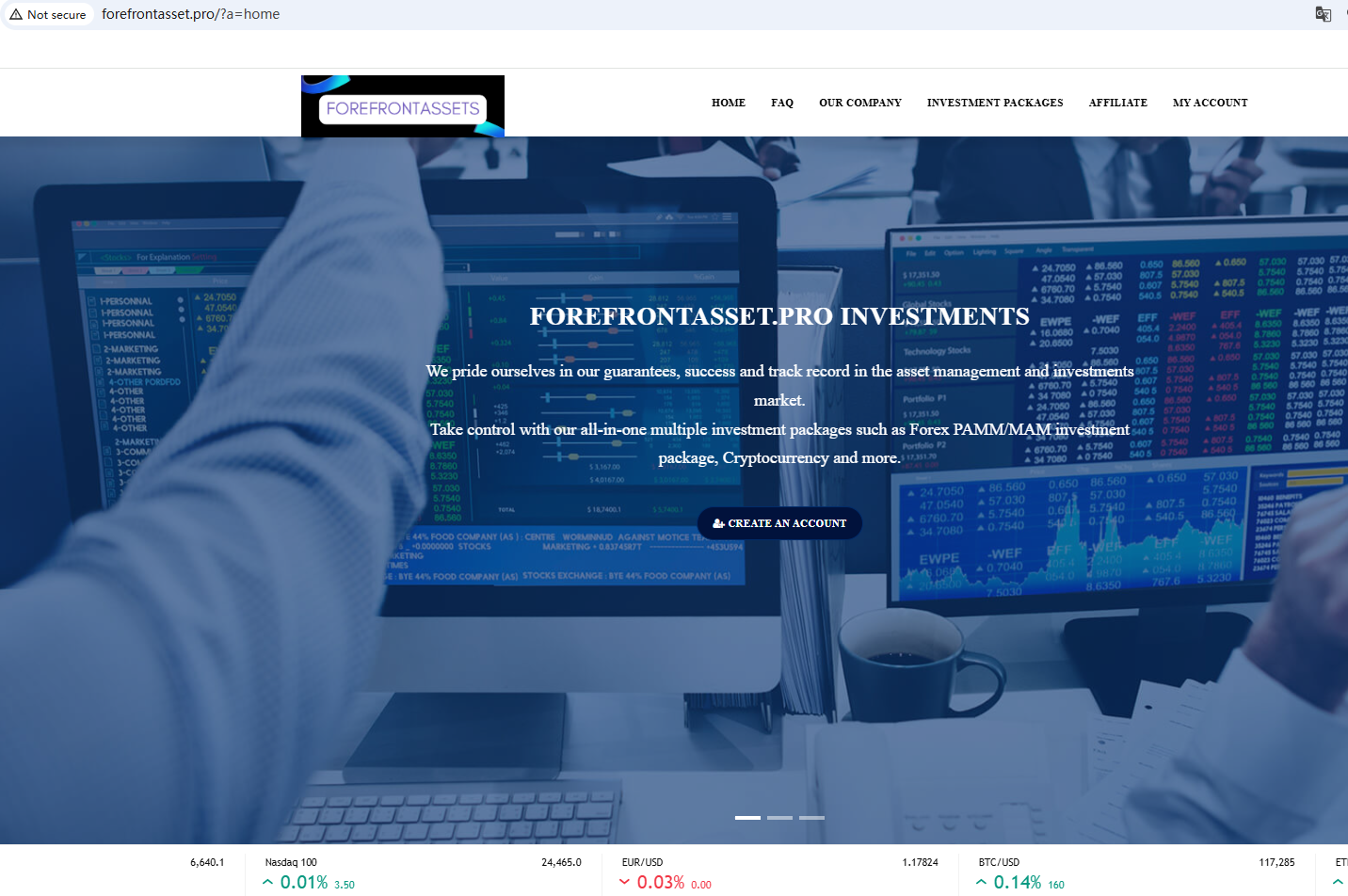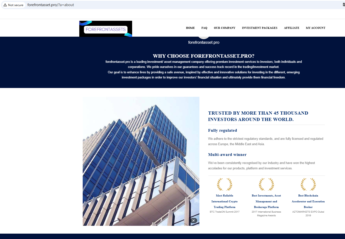 According to its website, it claims to be a reliable company, but it does not display any valid regulatory information on the website. Its address is in the UK, but we found that the Financial Conduct Authority (FCA) issued a warning regarding FOREFRONTASSETSS, suspecting that this company may be offering financial services or products without the necessary authorization.