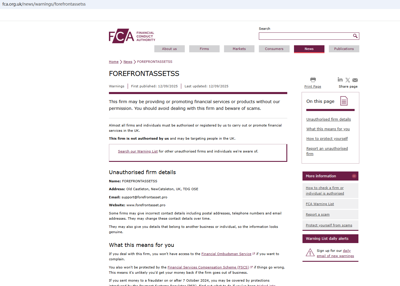 On September 12, 2025, the Financial Conduct Authority (FCA) issued a warning regarding FOREFRONTASSETSS, suspecting that this company may be offering financial services or products without the necessary authorization. https://www.fca.org.uk/news/warnings/forefrontassetss