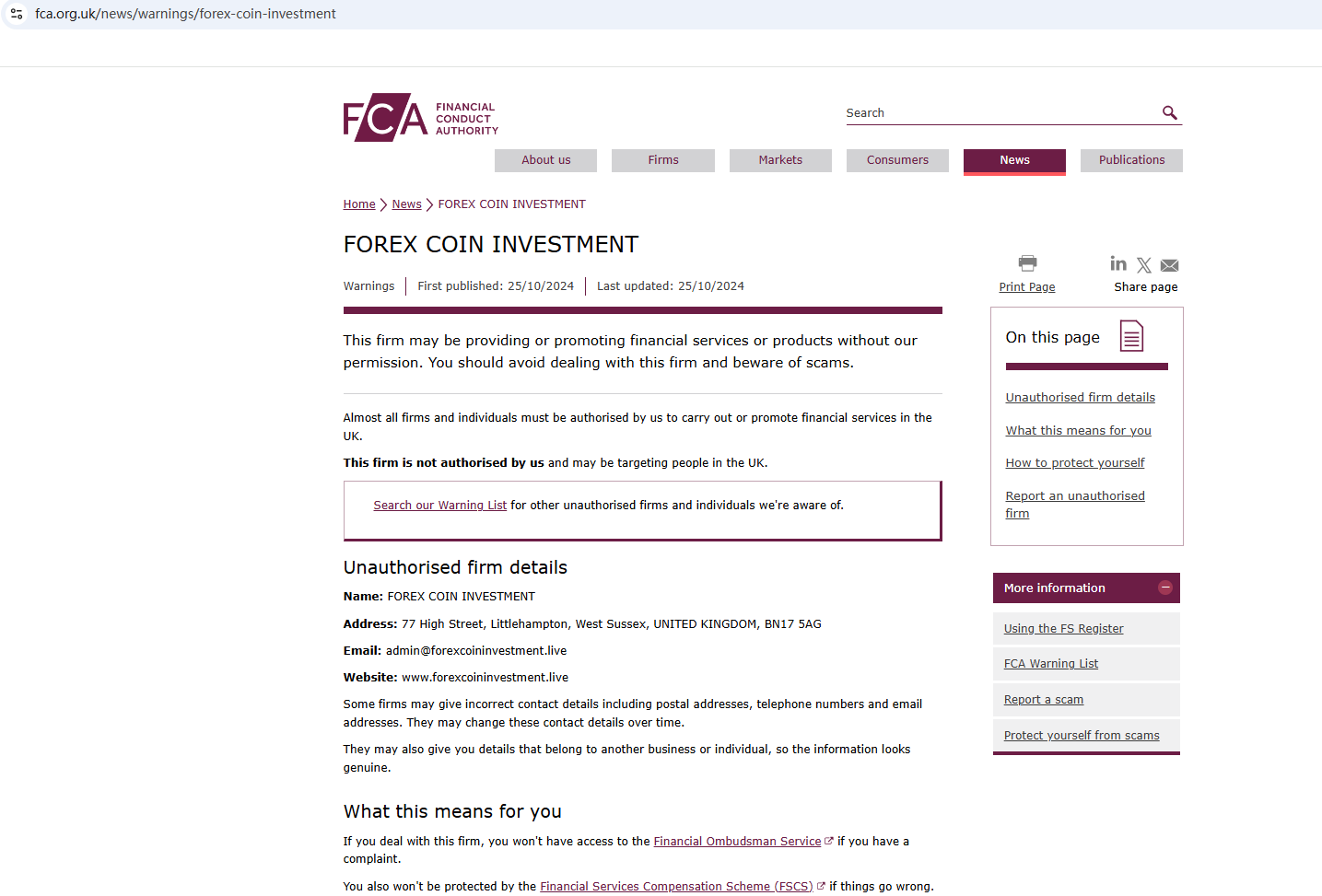 On 25 October 2024, the United Kingdom Financial Conduct Authority (FCA) issued a warning against FOREX COIN INVESTMENT, believing this company might be providing financial services or products without authorisation in the UK. You may visit: https://www.fca.org.uk/news/warnings/forex-coin-investment