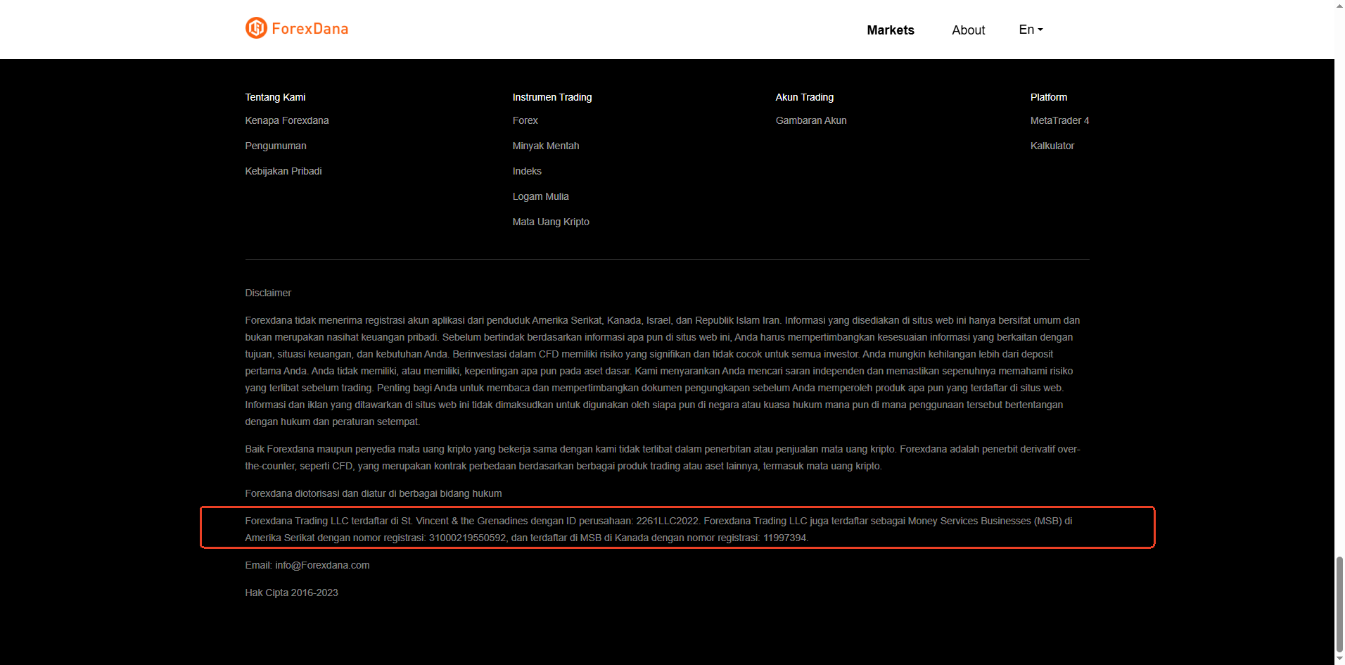 ForexDana claims to operate as Forexdana Trading LLC, registered in Saint Vincent and the Grenadines, and asserts it has obtained a Money Services Business (MSB) registration from the Financial Crimes Enforcement Network (FinCEN) and Financial Transactions and Reports Analysis Center of Canada (FINTRAC). However, our investigation reveals that no such entity is listed in the official registries of the Financial Services Authority (FSA) of Saint Vincent and the Grenadines, FINTRAC, or the U.S. FinCEN database.