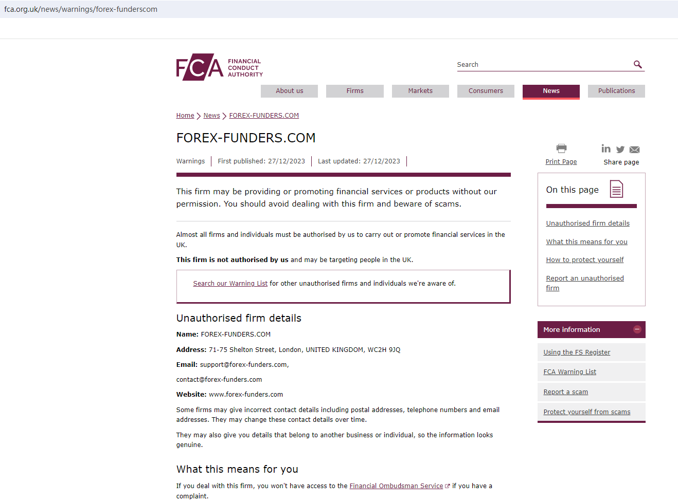 On 27 December 2023, the United Kingdom Financial Conduct Authority (UK FCA) issued a warning that FOREX-FUNDERS.COM was providing financial services or products in the UK without authorisation. You may visit: https://www.fca.org.uk/news/warnings/forex-funderscom