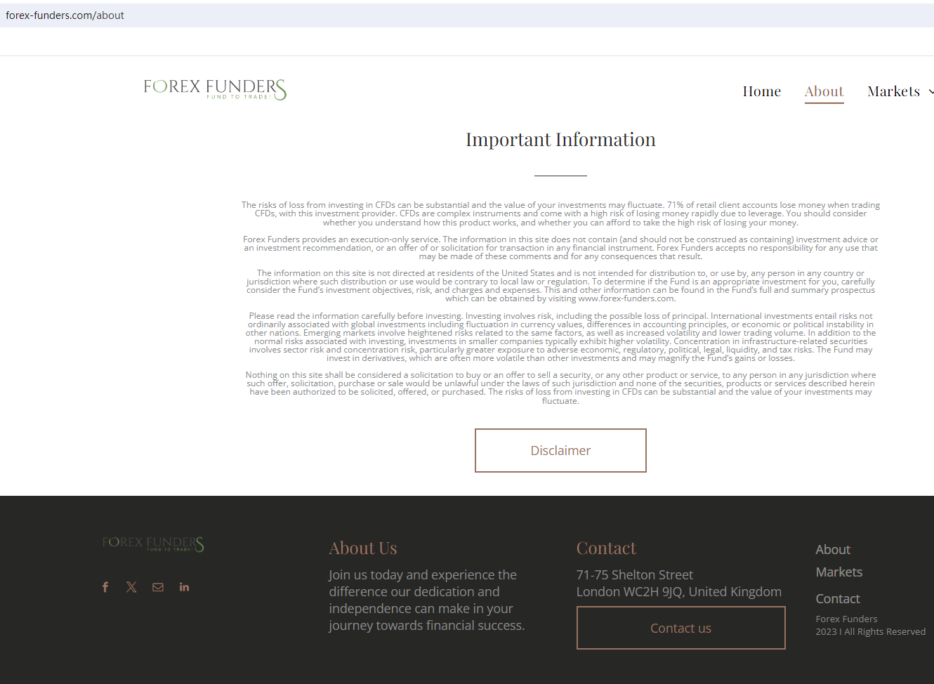 According to its website, it is located in the UK. Upon investigation, we found that the United Kingdom Financial Conduct Authority (UK FCA) issued a warning that FOREX-FUNDERS.COM was providing financial services or products in the UK without authorization.