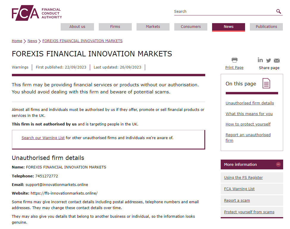 On 22 September 2023, the United Kingdom Financial Conduct Authority (UK FCA) issued a warning that FOREXIS FINANCIAL INNOVATION MARKETS was providing financial services or products in the UK without authorisation. You may visit: https://www.fca.org.uk/news/warnings/forexis-financial-innovation-markets