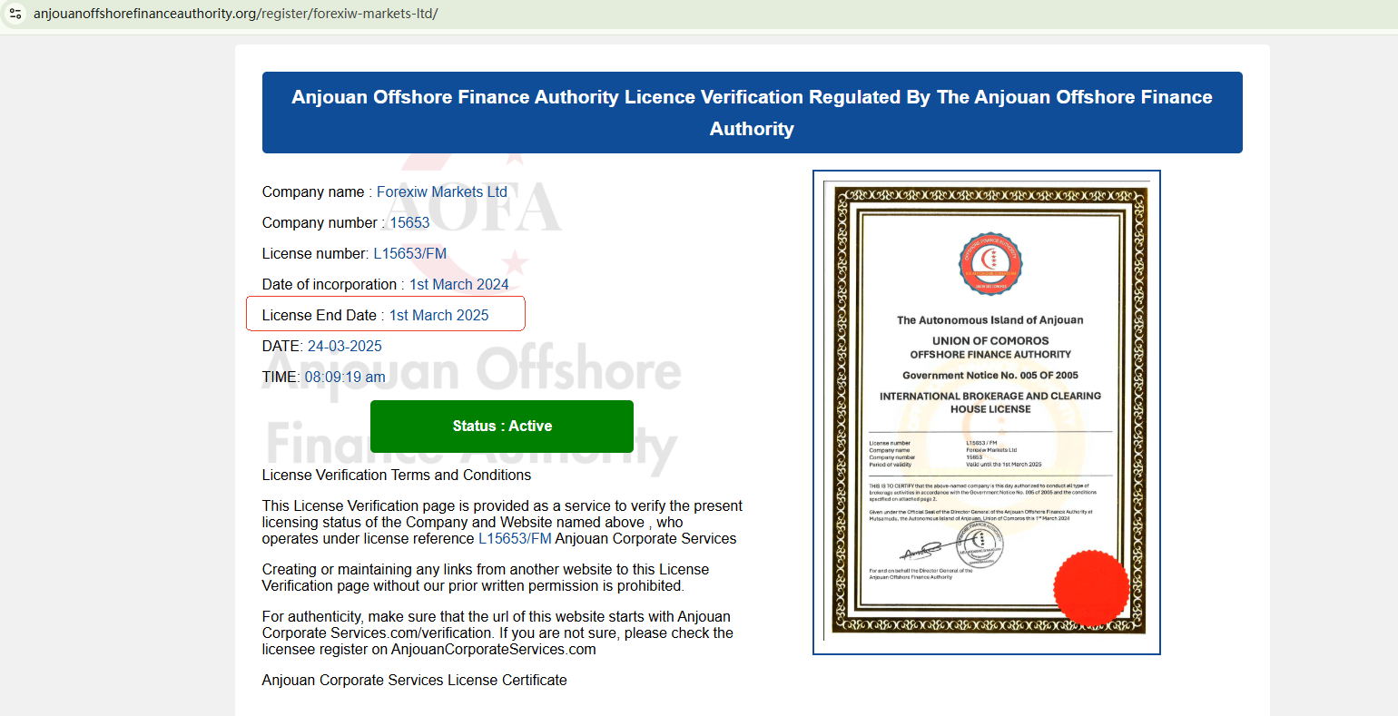 We have discovered that the Forexiw website is currently inaccessible. Furthermore, our verification has confirmed that its purported license, issued by the Anjouan Offshore Finance Authority (AOFA), expired on March 1, 2025. Based on the available evidence, we suspect that Forexiw may be operating as a scam. Investors should be made aware of this situation and are strongly urged to exercise extreme caution.