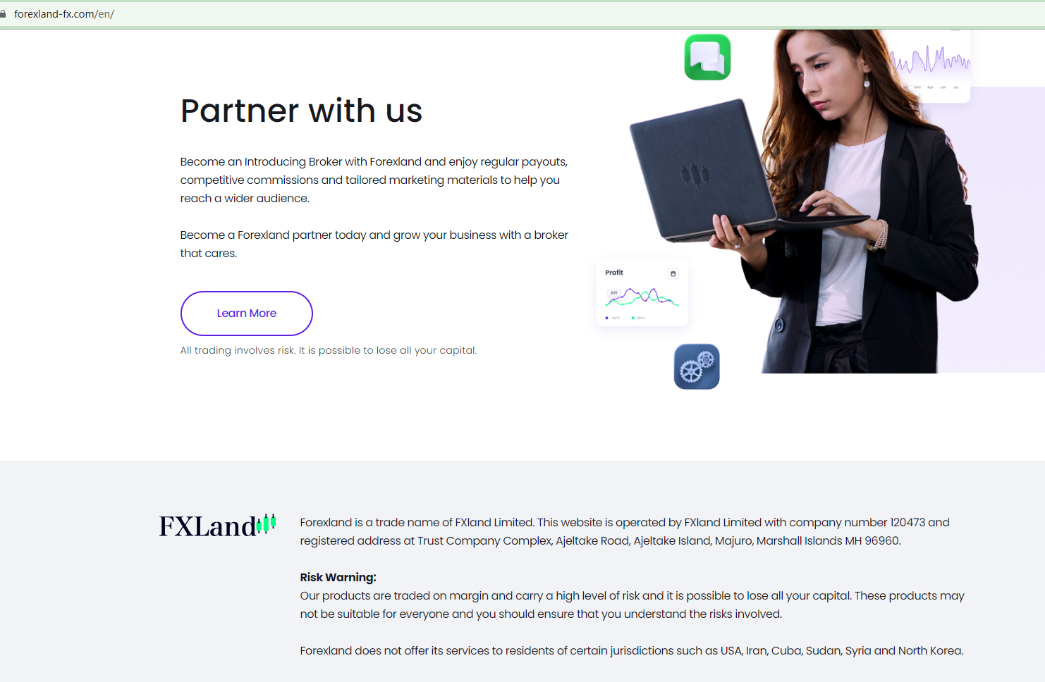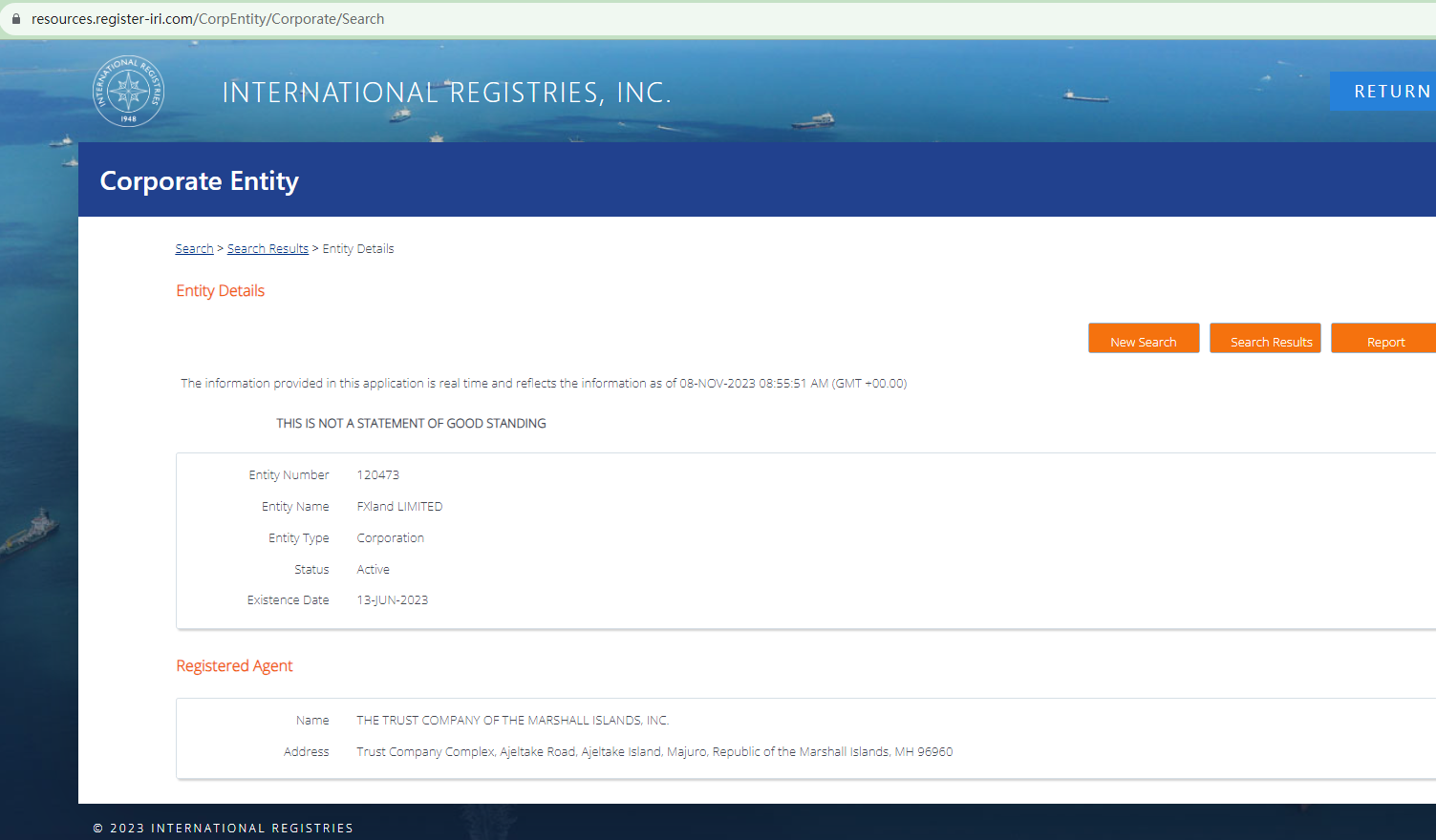 Forexland claims to be the trading name of FXland Limited, a company registered with the Marshall Islands Registry (IRI). While we did find matching entries in the IRI database, it is crucial to note that the IRI is a privately held maritime and corporate registry service provider that doesn't have the authority to issue licenses for forex brokers and regulate this industry. Mere registration with the IRI is meaningless in forex trading.