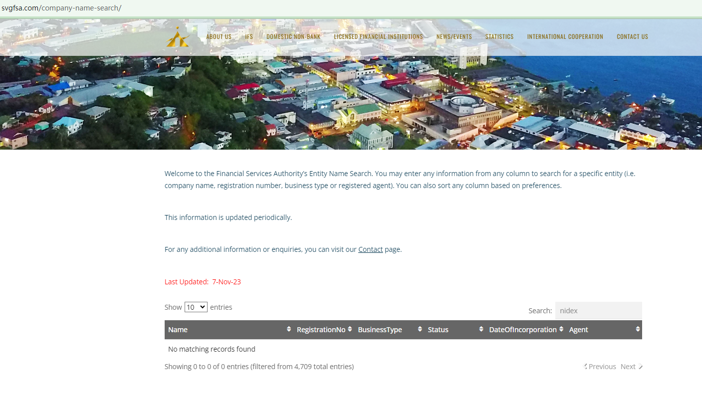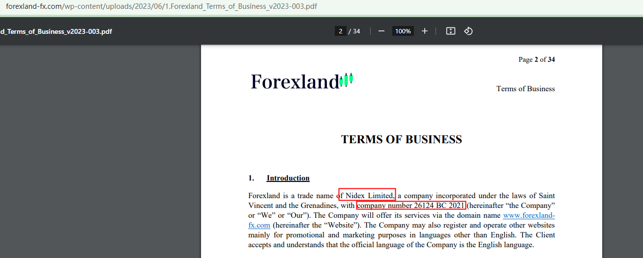 Furthermore, it is strange that, in its legal documents, Forexland purports to be affiliated with another company, Nidex Limited that is registered in St. Vincent and the Grenadines under registration number 26124BC2021. However, neither the company name nor the number exists in the register of the Financial Services Authority (SVG FSA).