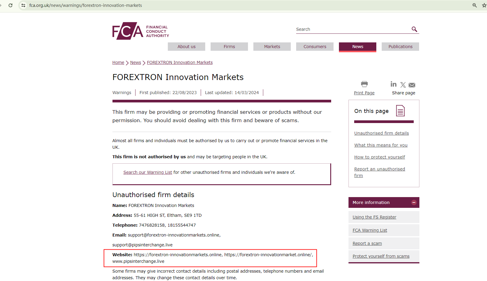The Financial Conduct Authority (FCA) detected fraudulent activities by FOREXTRON Innovation Markets on its original website, forextron-innovationmarkets.online, leading to its shutdown. However, the company has since launched two new domains, pipsinterchange.live and forextron-innovationmarket.online, to perpetuate its fraudulent schemes. In response to this evolving situation, the FCA has updated its warning about FOREXTRON Innovation Markets. https://www.fca.org.uk/news/warnings/forextron-innovation-markets