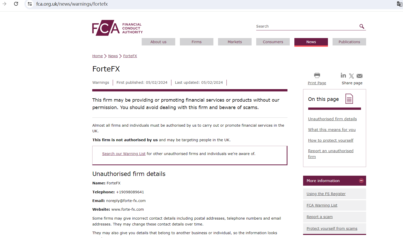 Furthermore, the Financial Conduct Authority (FCA) in the UK has issued a warning about ForteFX, categorizing it as an unauthorized entity.