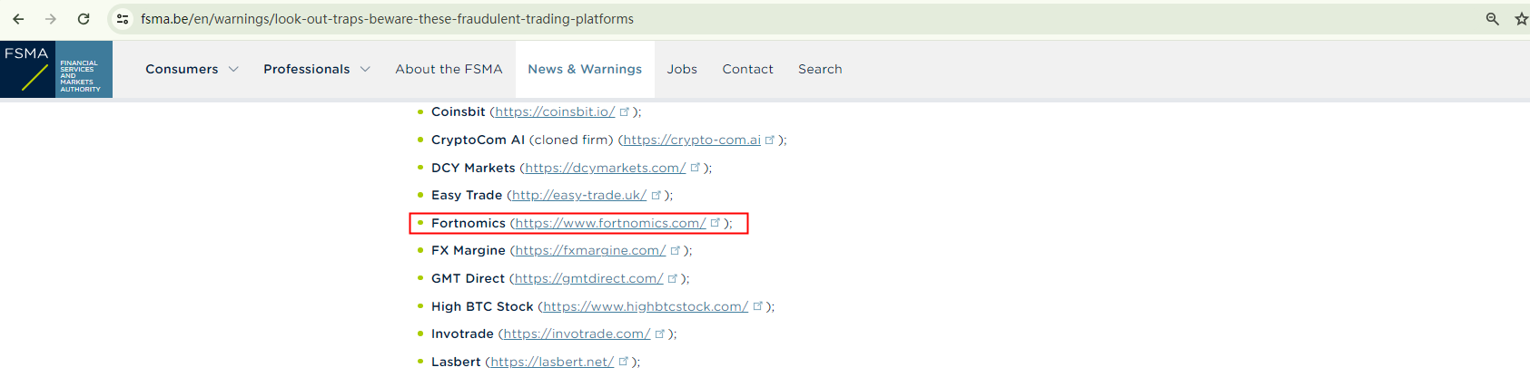 On May 16, 2024, the Belgian Financial Services and Markets Authority (FSMA) added Fortnomics to its warning list as a fraudulent trading platform operating in the Belgian market and advised investors to stay away from it. https://www.fsma.be/en/warnings/look-out-traps-beware-these-fraudulent-trading-platforms