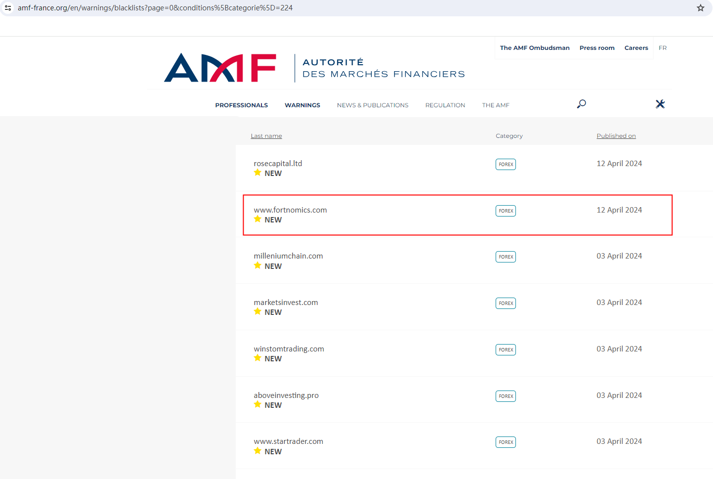 In addition, the Financial Authority (Autorité des Marchés Financiers, AMF) added Fortnomics to the warning list for it being an unauthorized company engaging in forex activities.