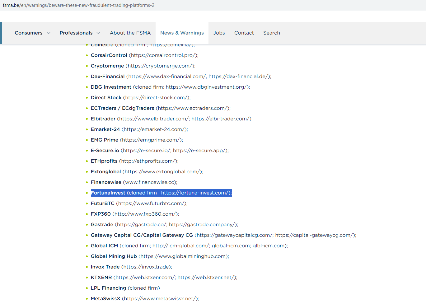On November 30, 2023, the Belgian Financial Services and Markets Authority (FSMA) added FortunaInvest to its warning list as a fraudulent trading platform operating in the Belgian market. https://www.fsma.be/en/warnings/beware-these-new-fraudulent-trading-platforms-2