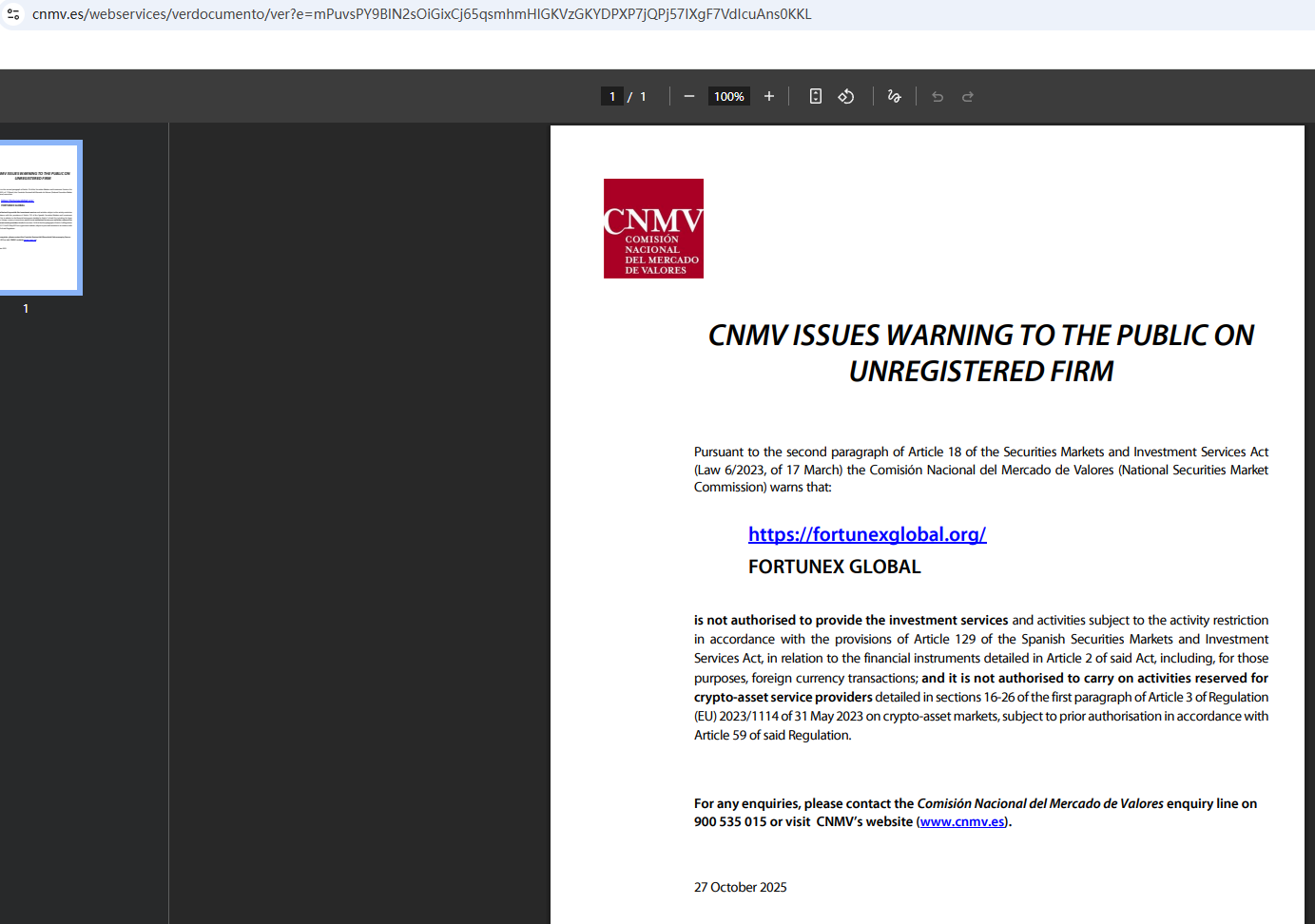 On Oct 27, 2025, the National Securities Market Commission (CNMV) issued a warning against Fortunex, believing this company might be providing financial services or products without proper authorization. https://www.cnmv.es/webservices/verdocumento/ver?e=mPuvsPY9BlN2sOiGixCj65qsmhmHlGKVzGKYDPXP7jQPj57IXgF7VdIcuAns0KKL