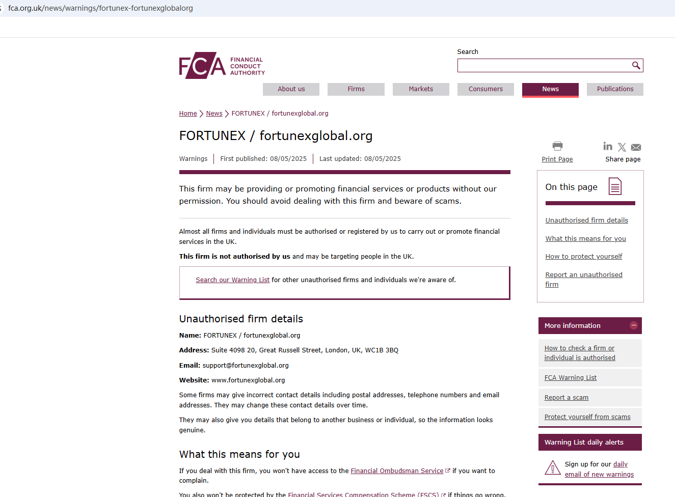 On May 8, 2025, the Financial Conduct Authority (FCA) issued a warning regarding Fortunex, suspecting that this company may be offering financial services or products without the necessary authorization. https://www.fca.org.uk/news/warnings/fortunex-fortunexglobalorg