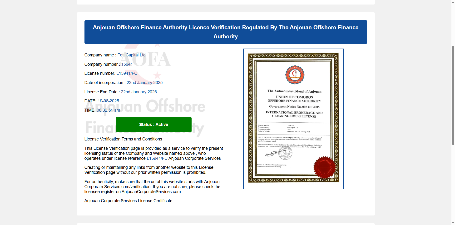 Foti Markets claims to be based in the Comoros and states that it is a trading name of Foti Capital Ltd, which is authorized by the Union of Comoros Offshore Finance Authority (UCOFA). Our investigation reveals that it is actually regulated by the Anjouan Offshore Finance Authority (AOFA). This regulatory body is known for extremely weak oversight, offers very limited investor protection, and is widely regarded as lacking credibility. Furthermore, AOFA does not maintain a public registry of licensed brokers on an official website, significantly increasing the risks for investors. Notably, Foti Markets does not appear to be supervised or licensed by any recognized mainstream financial regulatory authority. Due to these serious concerns, we have classified Foti Markets as a fraudulent broker.
