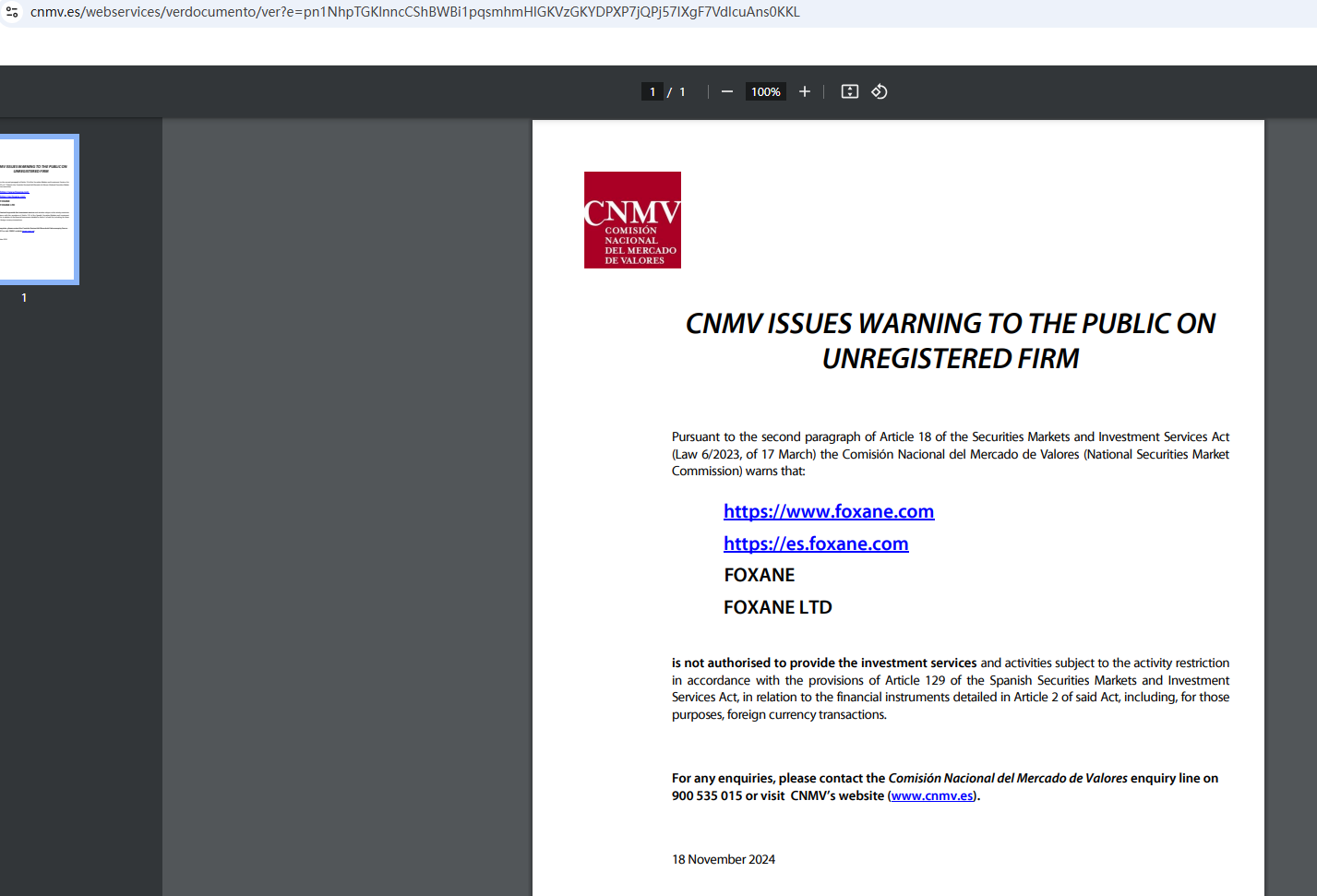 On November 18, 2024, the Comisión Nacional del Mercado de Valores (CNMV) added FOXANE to its warning list for providing investment services without authorization. https://www.cnmv.es/webservices/verdocumento/ver?e=pn1NhpTGKlnncCShBWBi1pqsmhmHlGKVzGKYDPXP7jQPj57IXgF7VdIcuAns0KKL