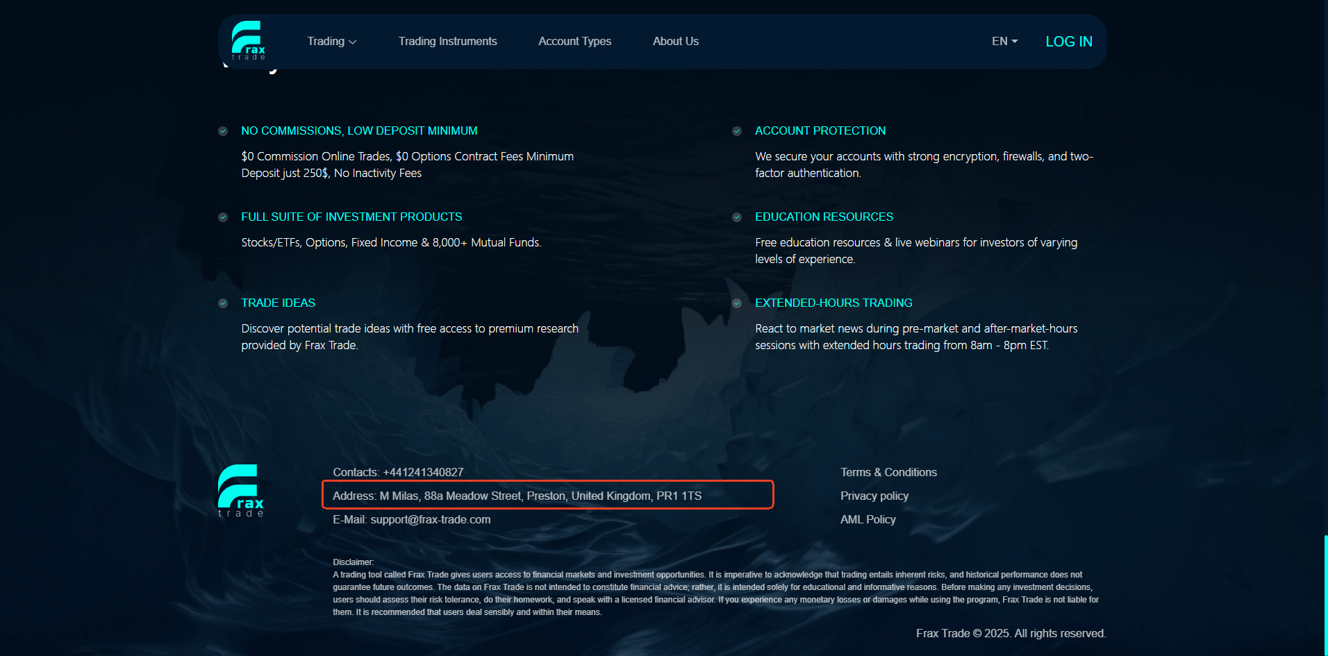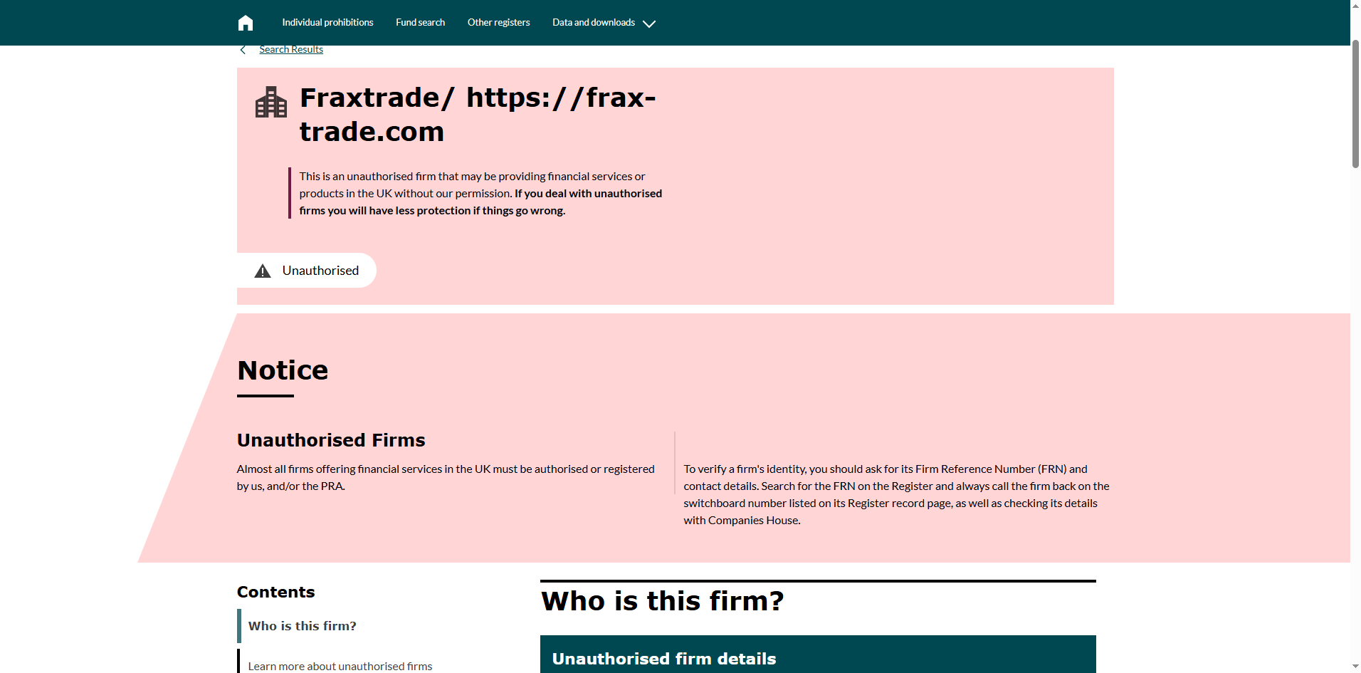 Frax Trade does not publicly disclose its regulatory information; it only presents a registered address and phone number in the United Kingdom. Upon our investigation with the Financial Conduct Authority (FCA), we have found that Frax Trade is not authorized by the FCA to conduct financial brokerage activities. Furthermore, the FCA has issued a public warning stating that this entity is providing financial services or products in the UK without proper authorization.