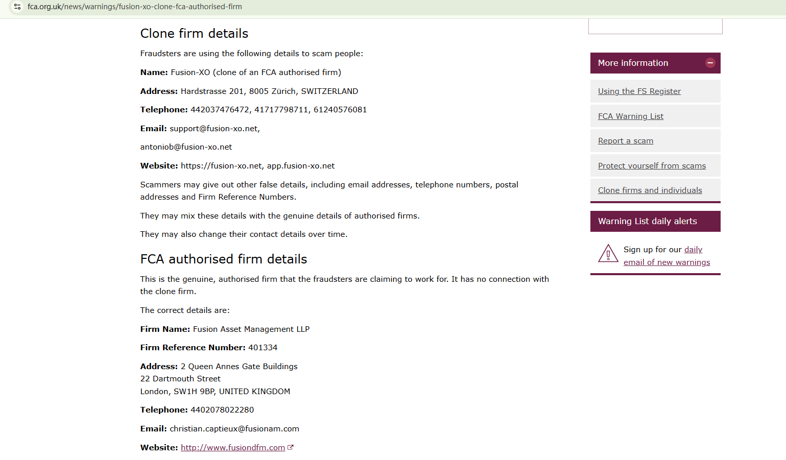 The website fusion-xo.net is quite new, with its domain registered in December 2024. The Financial Conduct Authority (FCA) has the information that fusion-xo.net misuses information of Fusion Asset Management LLP, an FCA-authorized entity, to create the illusion of being legitimate or licensed. This is fraudulent and deceitful. Investors should stay vigliant and do not respond to any offerings from fusion-xo.net.