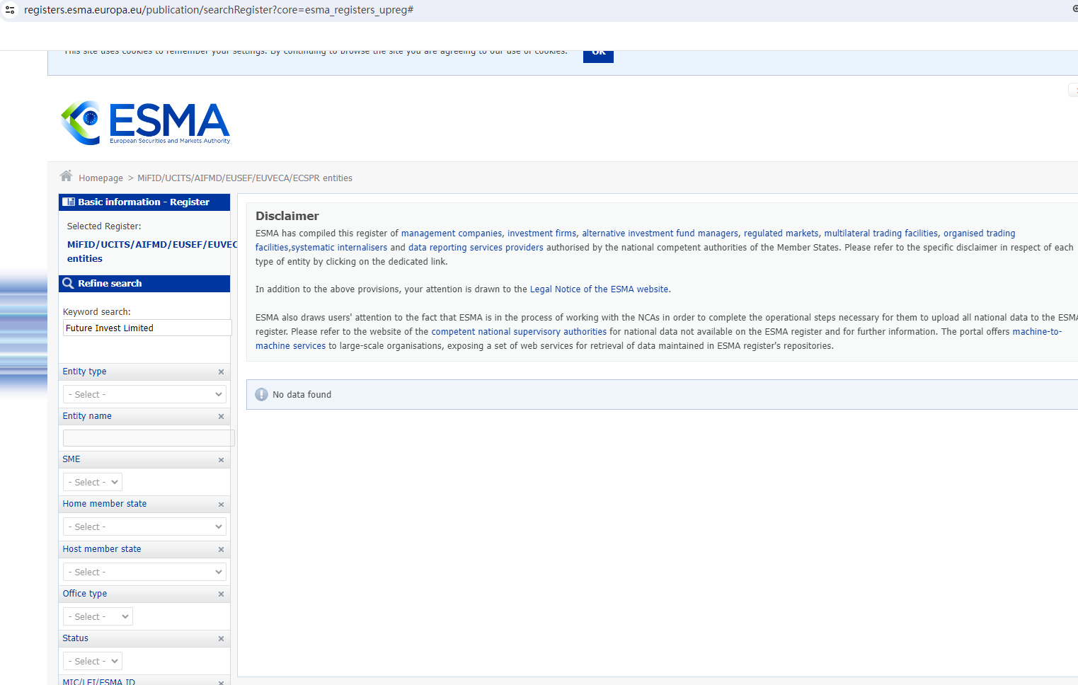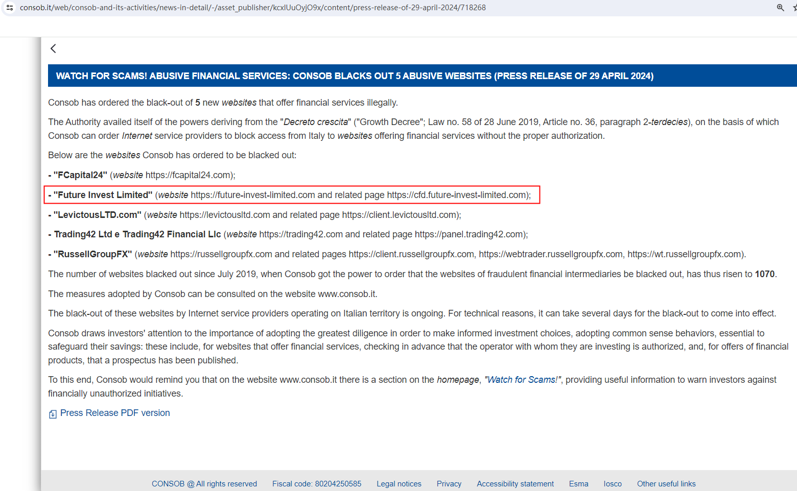 In addition, the Commissione Nazionale per le Società e la Borsa (CONSOB) issued a warning that Future Invest Limited was providing financial services or products without authorisation.