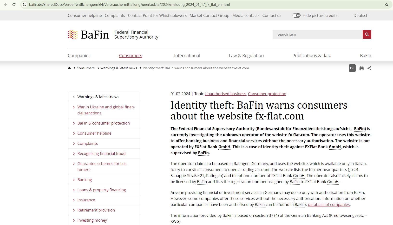 FX FLAT BANK has been investigated by the Federal Financial Supervisory Authority (BaFin), as the unknown operator of the website fx-flat.com uses this website to offer banking business and financial services without the necessary authorisation.