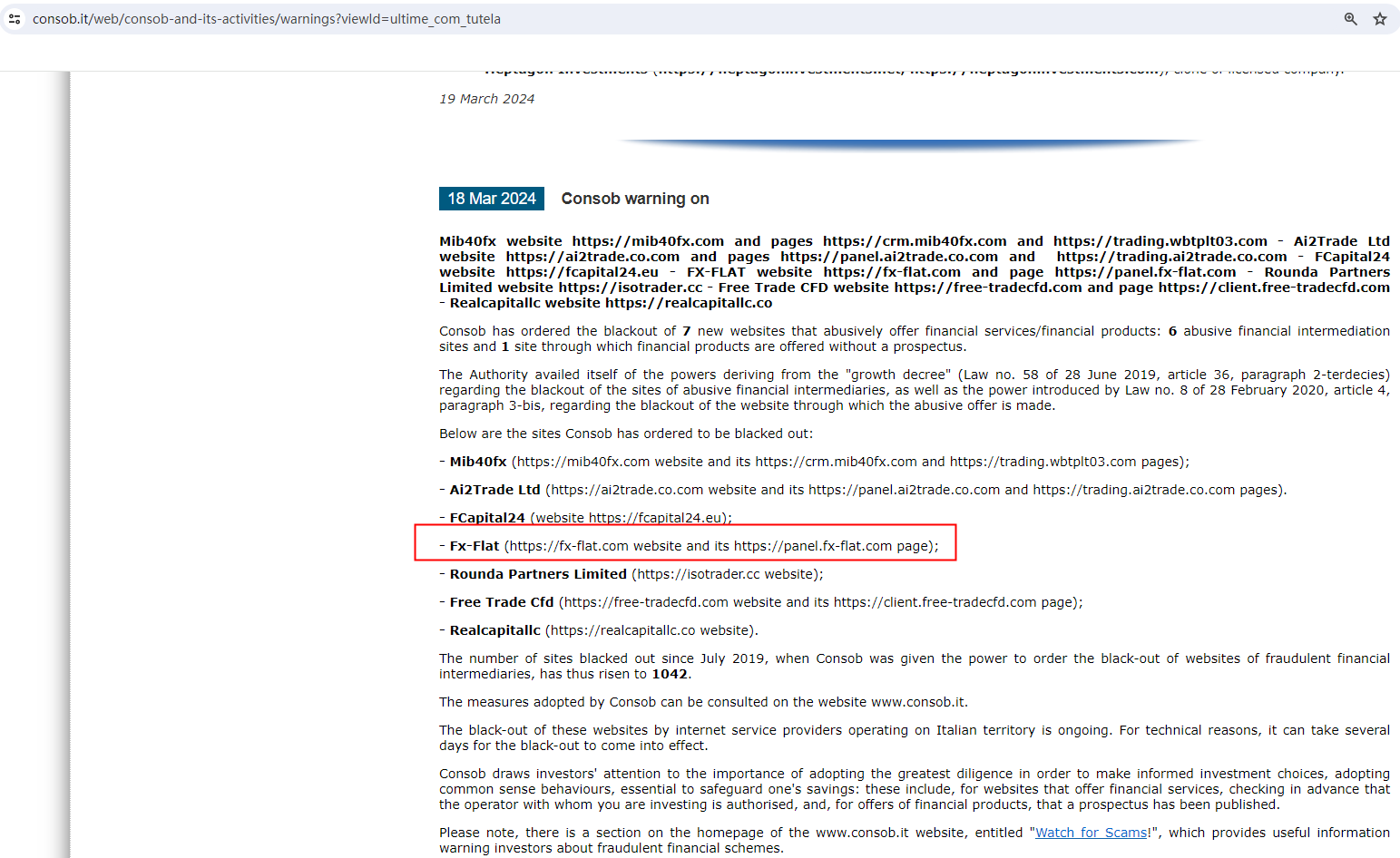 On March 18, 2024, the Commissione Nazionale per le Società e la Borsa (CONSOB) added FX FLAT BANK to its warning list as a fraudulent trading platform. https://www.consob.it/web/consob-and-its-activities/warnings?viewId=ultime_com_tutela
