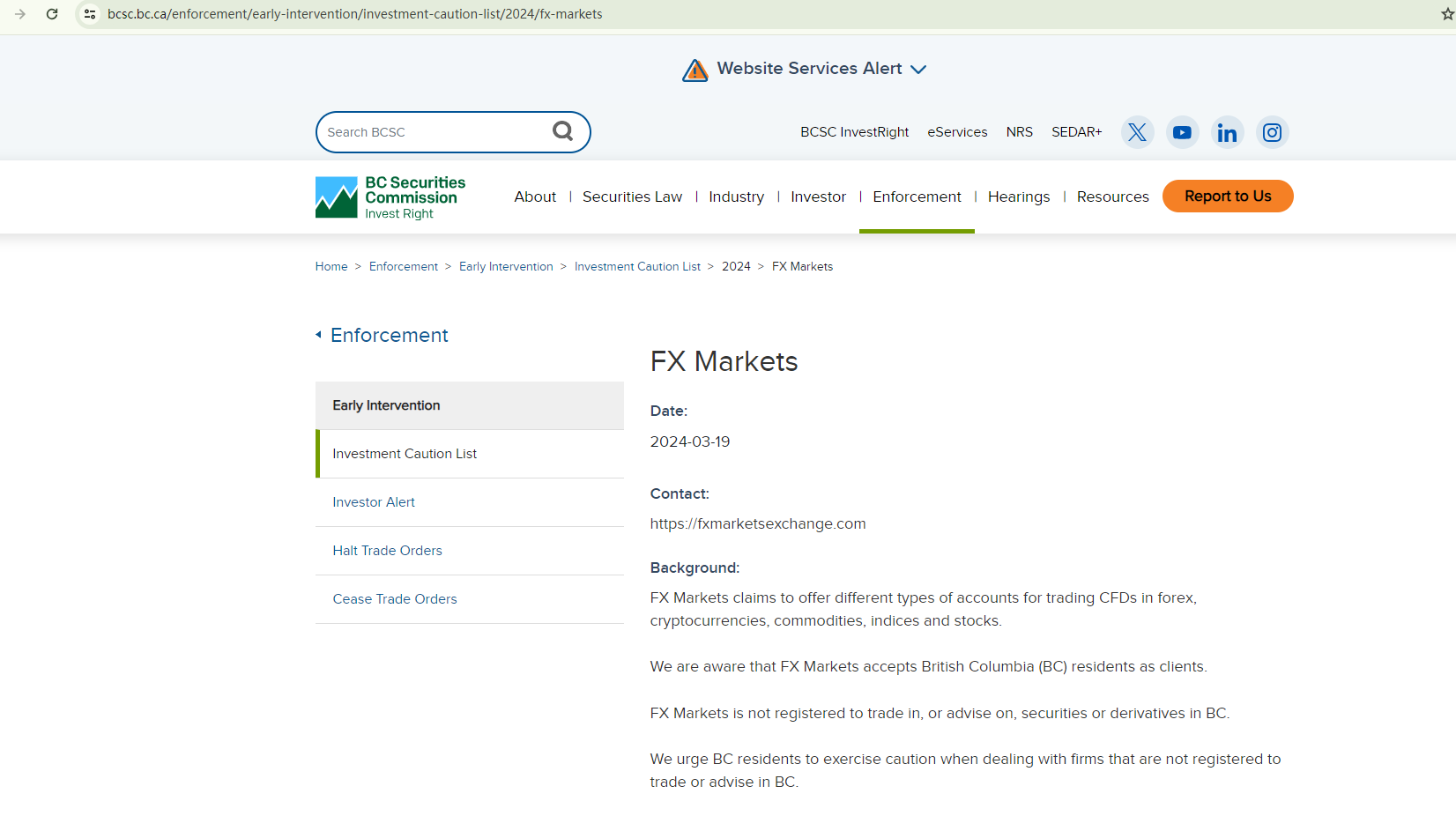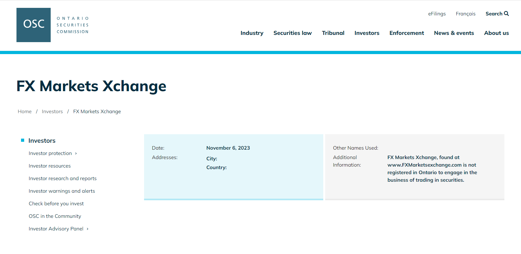 On 6 November 2023, the Ontario Securities Commission (OSC) issued a warning that FX Markets Xchange was providing financial services or products without authorisation. You may visit: https://www.osc.ca/en/investors/warnings/fx-markets-xchange