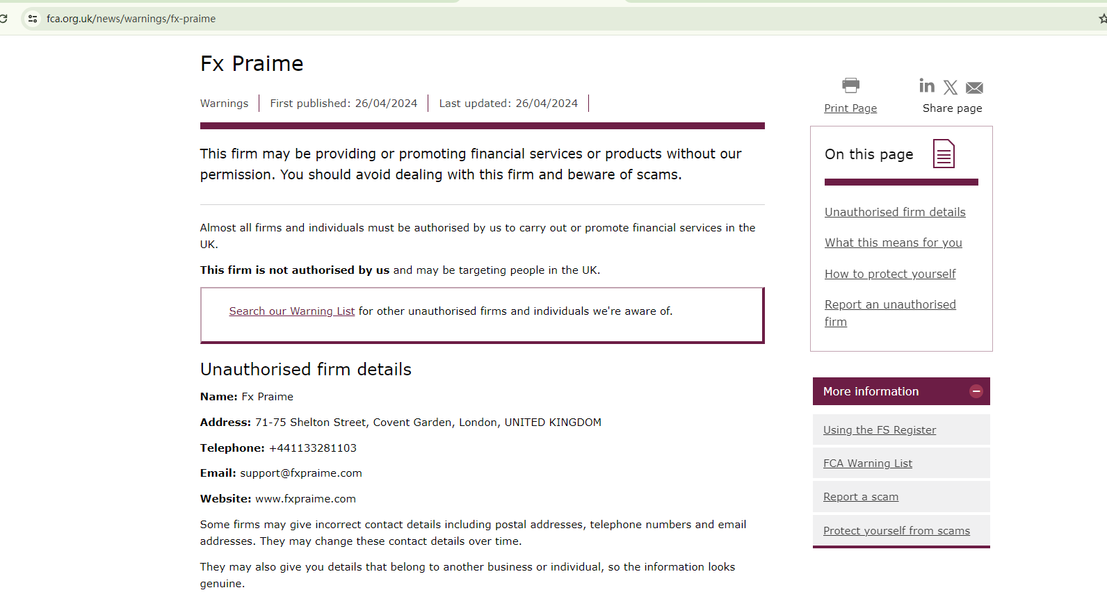 On April 26, 2024, the Financial Conduct Authority (FCA) issued a warning against Fx Praime, believing this company might be providing financial services or products without proper authorization in the UK. https://www.fca.org.uk/news/warnings/fx-praime