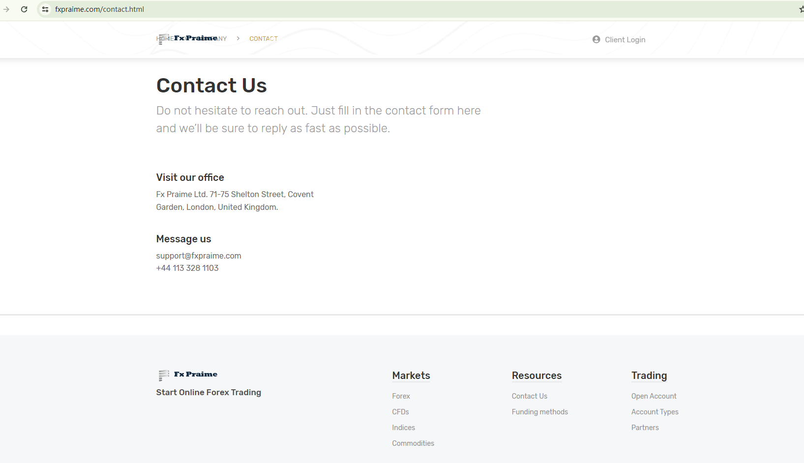 Fx Praime claims to be located in the UK. As per UK law, almost all individuals and businesses are required to obtain authorization from the Financial Conduct Authority (FCA). However, Fx Praime has failed to do so and hence prompted a warning from the FCA.