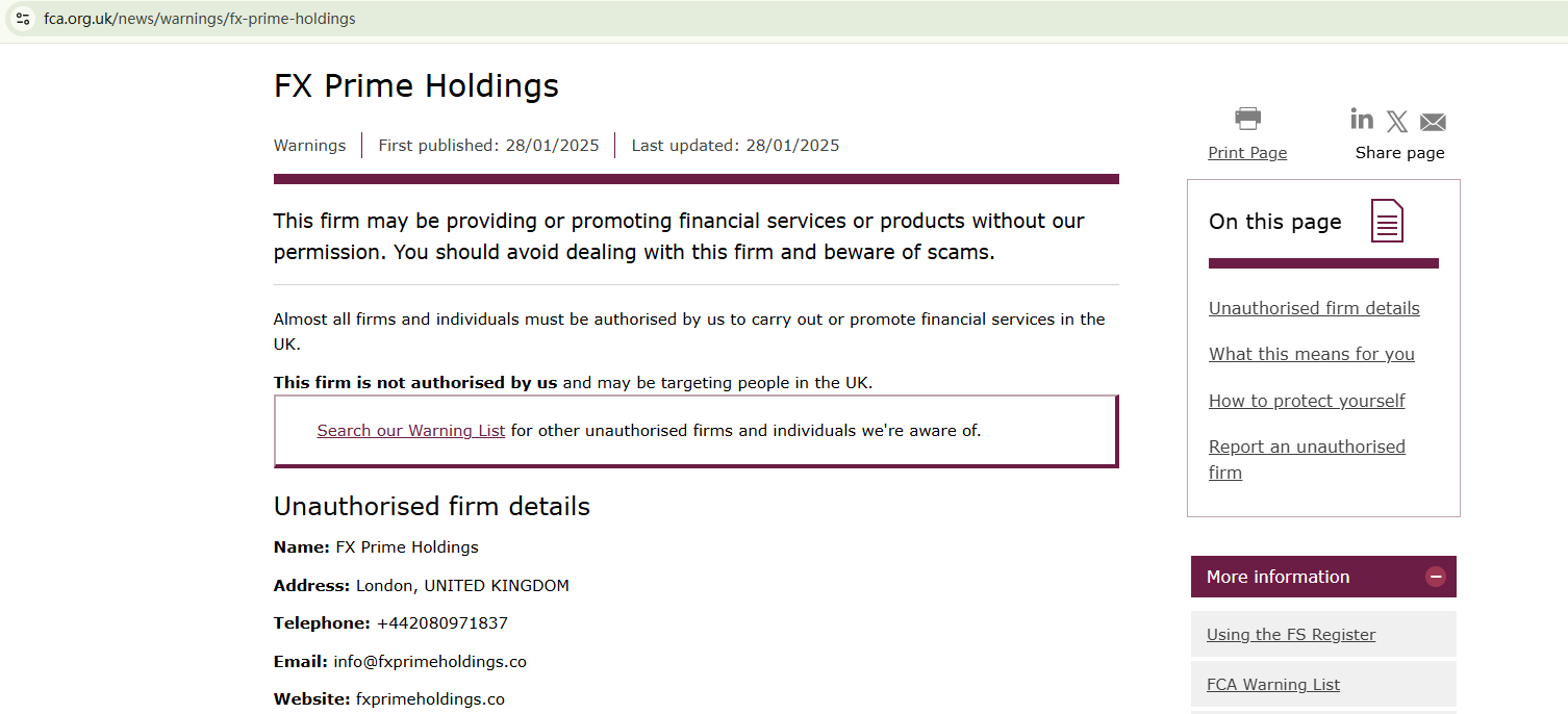 On January 28, 2025, the Financial Conduct Authority (FCA) issued a warning against FX Prime Holdings, believing this company might be providing financial services or products without proper authorization in the UK. https://www.fca.org.uk/news/warnings/fx-prime-holdings