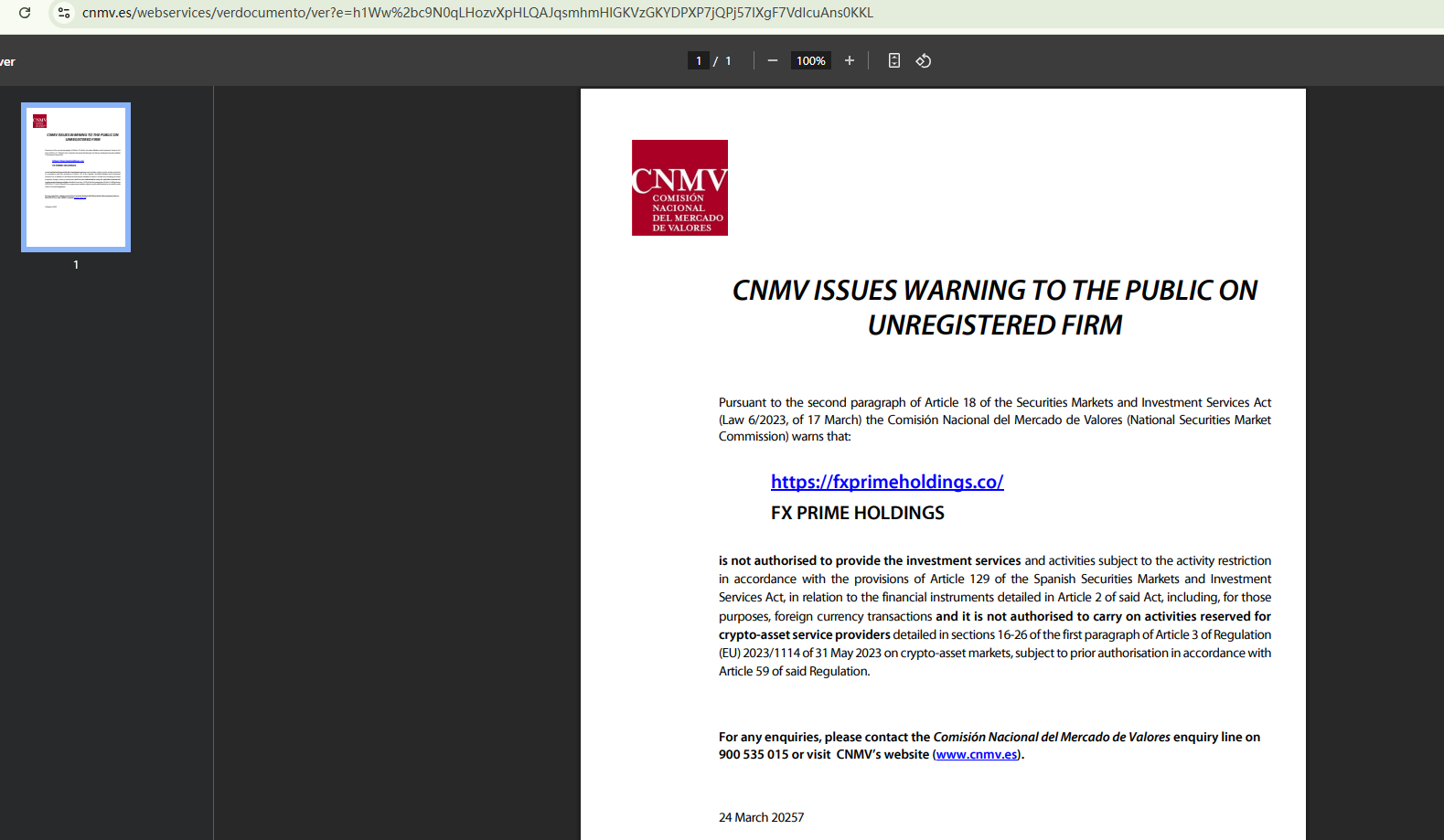 On March 24, 2025, the Comisión Nacional del Mercado de Valores (CNMV) has added FX Prime Holdings to its warning list for providing investment services without authorization. https://www.cnmv.es/Portal/ResultadoBusqueda?tipo=1&nombre=FXPRIMEHOLDINGS