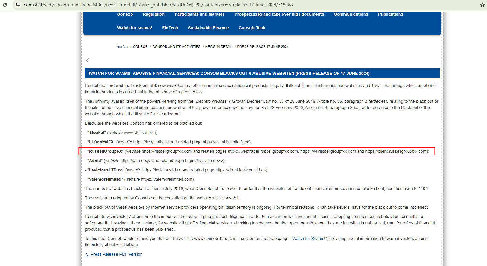 On June 17, 2024, the Italian Companies and Exchange Commission (CONSOB) ordered FX Russell’s website to be blacked out since it offers financial services illegally in Italy. https://www.consob.it/web/consob-and-its-activities/news-in-detail/-/asset_publisher/kcxlUuOyjO9x/content/press-release-17-june-2024/718268