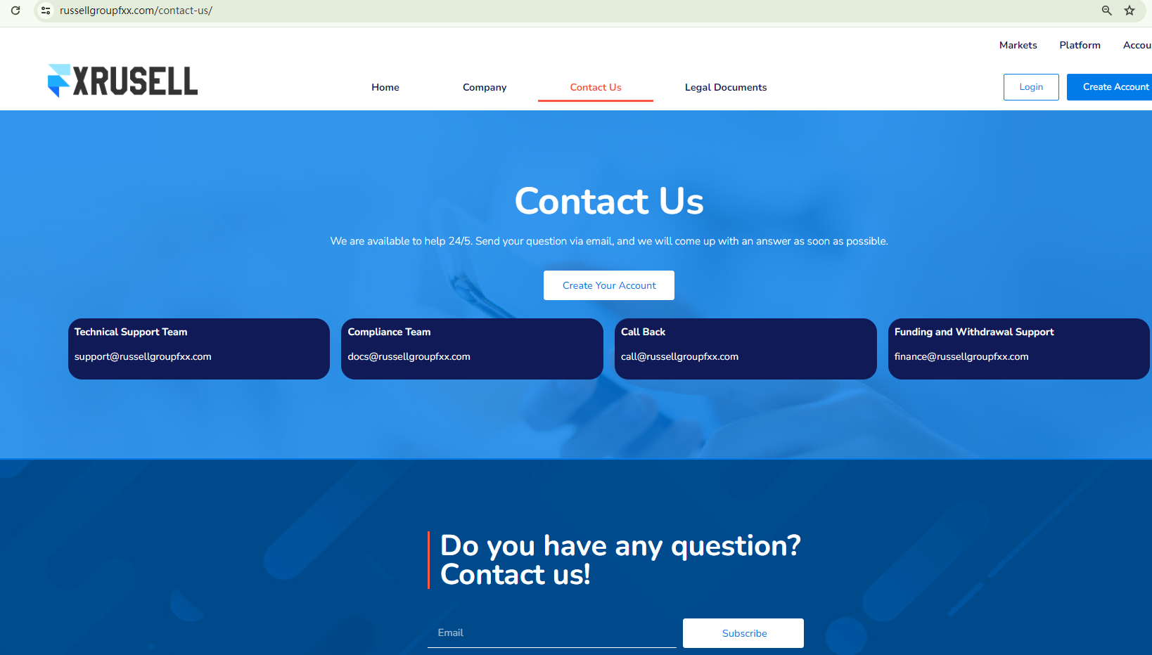 The only communication channels offered by FX Russell are email addresses and a web form. These can be easily fabricated and deactivated, potentially leaving investors without recourse or the ability to obtain refunds due to the lack of transparent company information.
