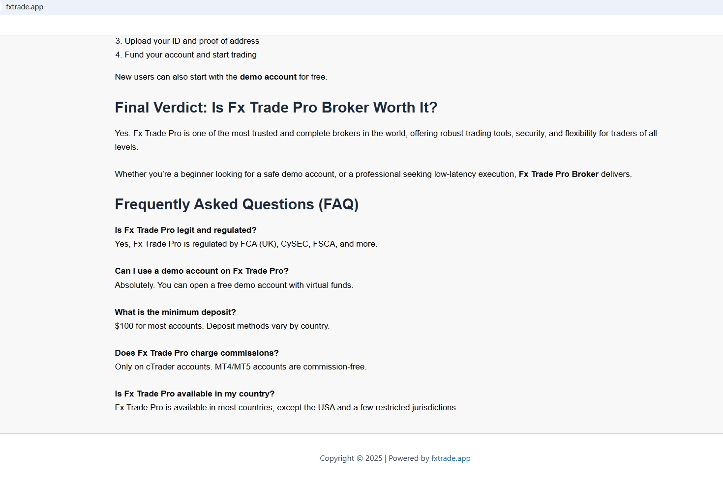 In essence, FX Trade Pro Broker is not regulated by any governing body. Entrusting it with investors' funds is highly risky, as there are no legal protections in place to safeguard the funds. FX Trade Pro Broker appears to be a scam.
